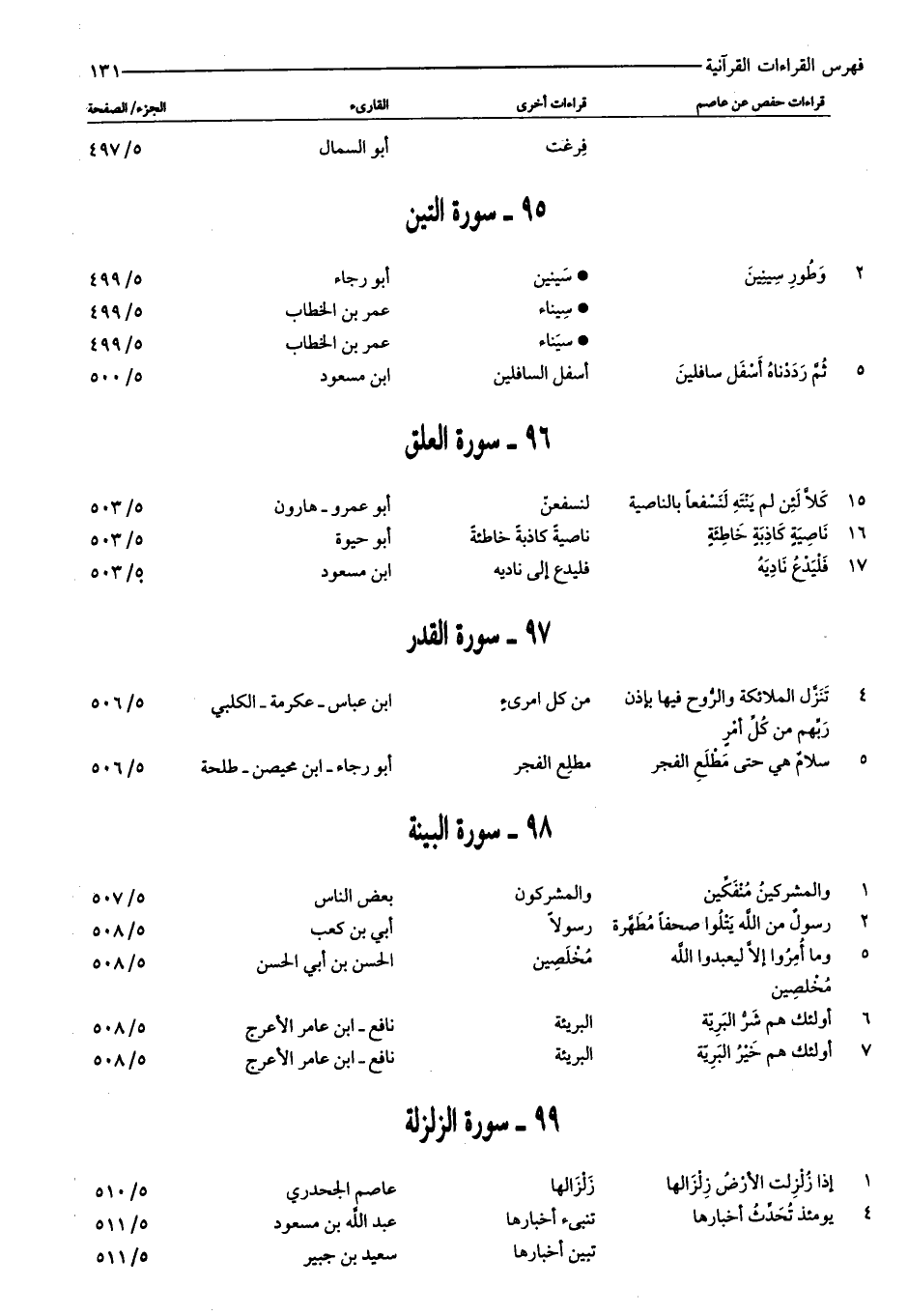 ٢: وَطُورِ سِينِينَ: سينين: أبو رجاء: ٥/ ٤٩٩ سيناء: عمر بن الخطاب: ٥/ ٤٩٩ سيناء: عمر بن الخطاب: ٥/ ٤٩٩ ٥: ثُمَّ رَدَدْناهُ أَسْفَلَ سافِلِينَ: أسفل السافلين: ابن مسعود: ٥/ ٥٠٠