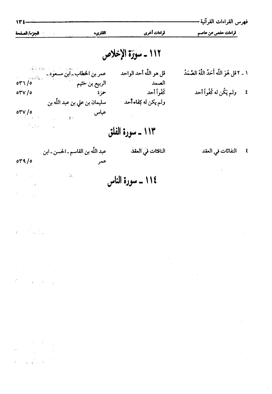 ١- ٢: قُلْ هُوَ اللَّهُ أَحَدٌ اللَّهُ الصَّمَدُ: قل هو الله أحد الواحد: عمر بن الخطاب- ابن مسعود- الصمد: الربيع بن خثيم: ٥/ ٥٣٦ ٤: وَلَمْ يَكُنْ لَهُ كُفُواً أَحَدٌ: كفوا أحد: حمزة: ٥/ ٥٣٧ ولم يكن له كفاء أحد: سليمان بن علي بن عبد الله بن عباس: ٥/ ٥٣٧