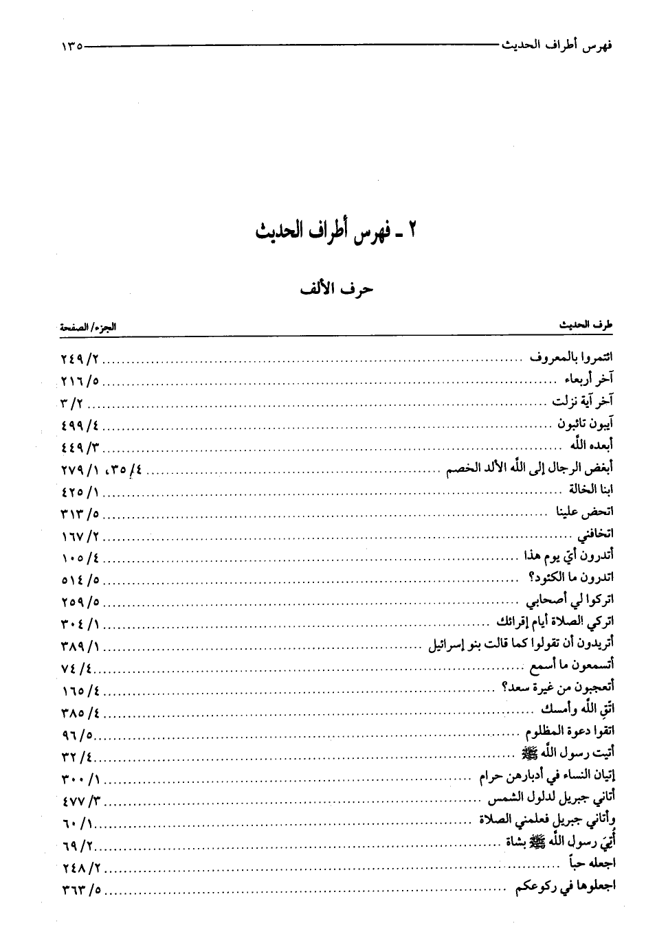حرف الألف طرف الحديث: الجزء/ الصحفة ائتمروا بالمعروف: ٢/ ٢٤٩ آخر أربعاء: ٥/ ٢١٦ آخر آية نزلت: ٢/ ٣ آئبون تائبون: ٤/ ٤٩٩ أبعده الله: ٣/ ٤٤٩ أبغض الرجال إلى الله الألد الخصم: ٤/ ٣٥، ١/ ٢٧٩ ابنا الخالة: ١/ ٤٢٥ أتحض علينا: ٥/ ٣١٣ أتخافني: ٢/ ١٦٧ أتدرون أيّ يوم هذا: ٤/ ١٠٥ أتدرون ما الكئود؟: ٥/ ٥١٤ اتركوا لي أصحابي: ٥/ ٢٥٩ اتركي الصلاة أيام إقرائك: ١/ ٣٠٤ أتريدون أن تقولوا كما قالت بنو إسرائيل: ١/ ٣٨٩ أتسمعون ما أسمع: ٤/ ٧٤ أتعجبون من غيرة سعد؟: ٤/ ١٦٥ اتّق الله وأمسك: ٤/ ٣٨٥ اتقوا دعوة المظلوم: ٥/ ٩٦ أتيت رسول الله صلى الله عليه وسلّم: ٤/ ٣٢ إتيان النساء في أدبارهن حرام: ١/ ٣٠٠ أتاني جبريل لدلول الشمس: ٣/ ٤٧٧ وأتاني جبريل فعلمني الصلاة: ١/ ٦٠ أتي رسول الله صلى الله عليه وسلّم بشاة: ٢/ ٦٩ اجعله حبا: ٢/ ٢٤٨ اجعلوها في ركوعكم: ٥/ ٣٦٣