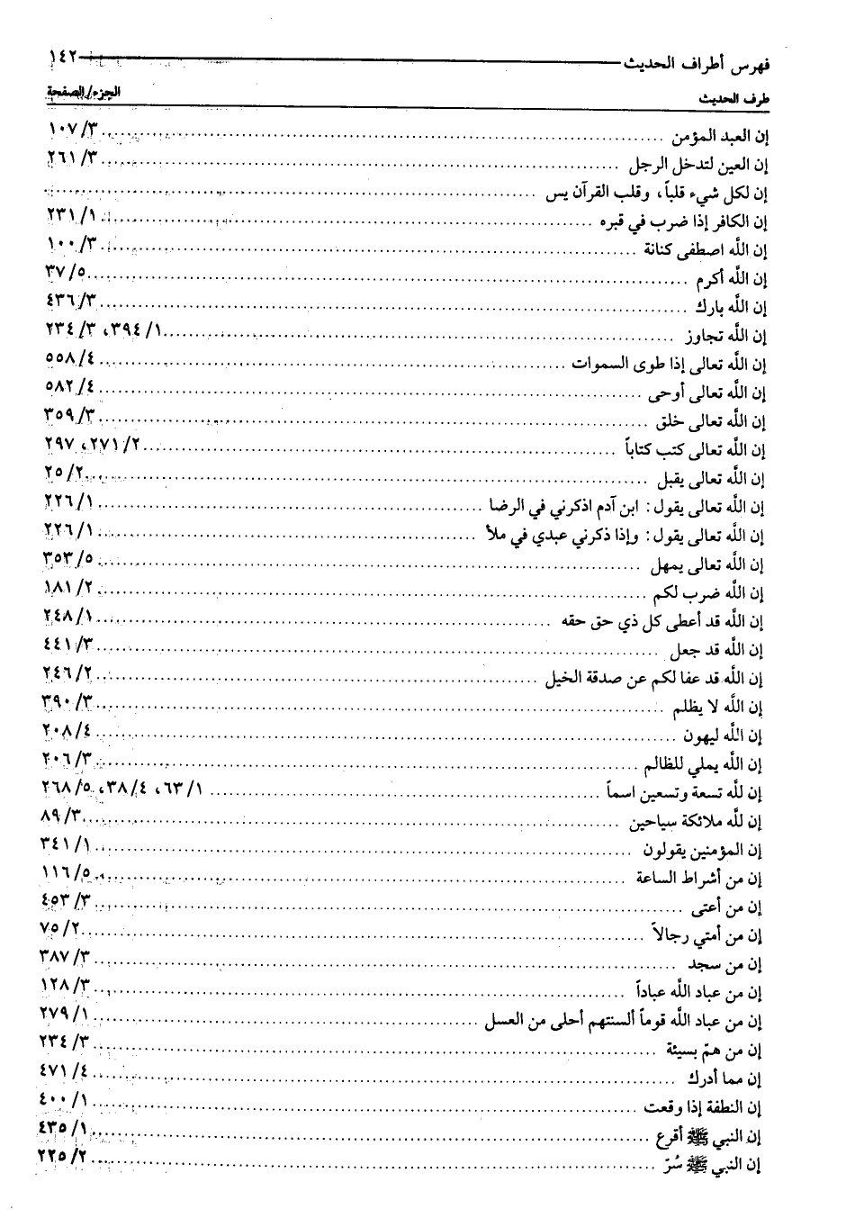 إن العبد المؤمن: ٣/ ١٠٧ إن العين لتدخل الرجل: ٣/ ٢٦١ إن لكل شيء قلبا، وقلب القرآن يس: إن الكافر إذا ضرب في قبره: ١/ ٢٣١ إن الله اصطفى كنانة: ٣/ ١٠٠ إن الله أكرم: ٥/ ٣٧ إن الله بارك: ٣/ ٤٣٦ إن الله تجاوز: ١/ ٣٩٤، ٣/ ٢٣٤ إن الله تعالى إذا طوى السموات: ٤/ ٥٥٨ إن الله تعالى أوحى: ٤/ ٥٨٢ إن الله تعالى خلق: ٣/ ٣٥٩ إن الله تعالى كتب كتابا: ٢/ ٢٧١، ٢٩٧ إن الله تعالى يقبل: ٢/ ٢٥ إن الله تعالى يقول: ابن آدم اذكرني في الرضا: ١/ ٢٢٦ إن الله تعالى يقول: وإذا ذكرني عبدي في ملأ: ١/ ٢٢٦ إن الله تعالى يمهل: ٥/ ٣٥٣ إن الله ضرب لكم: ٢/ ١٨١ إن الله قد أعطى كل ذي حق حقه: ١/ ٢٤٨ إن الله قد جعل: ٣/ ٤٤١ إن الله قد عفا لكم عن صدقة الخيل: ٢/ ٢٤٦ إن الله لا يظلم: ٣/ ٣٩٠ إن الله ليهون: ٤/ ٢٠٨ إن الله يملي للظالم: ٣/ ٢٠٦ إن لله تسعة وتسعين اسما: ١/ ٦٣، ٤/ ٣٨، ٥/ ٢٦٨ إن لله ملائكة سياحين: ٣/ ٨٩ إن المؤمنين يقولون: ١/ ٣٤١ إن من أشراط الساعة: ٥/ ١١٦ إن من أعتى: ٣/ ٤٥٣ إن من أمتي رجالا: ٢/ ٧٥ إن من سجد: ٣/ ٣٨٧ إن من عباد الله عبادا: ٣/ ١٢٨ إن من عباد الله قوما ألسنتهم أحلى من العسل: ١/ ٢٧٩ إن من همّ بسيئة: ٣/ ٢٣٤ إن مما أدرك: ٤/ ٤٧١ إن النطفة إذا وقعت: ١/ ٤٠٠ إن النبي صلى الله عليه وسلّم أقرع: ١/ ٤٣٥ إن النبي صلى الله عليه وسلّم سرّ: ٢/ ٢٢٥