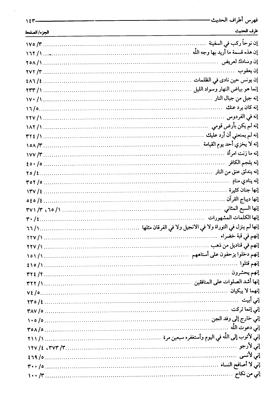 إن نوحا ركب في السفينة: ٣/ ١٧٥ إن هذه قسمة ما أريد بها وجه الله: ١/ ١٦٢ إن وسادك لعريض: ١/ ٢٥٨ إن يعقوب: ٣/ ٢٧٢ إن يونس حين نادى في الظلمات: ٤/ ٤٨٦ إنما هو بياض النهار وسواد الليل: ١/ ٢٣٣ إنه جبل من جبال النار: ١/ ١٧٠ إنه كان يرد عنك: ٥/ ١٦ إنه في الفردوس: ١/ ٢٢٧ إنه لم يكن بأرض قومي: ١/ ١٨٢ إنه لم يمنعني أن أرد عليك: ١/ ٣٢٤ إنه لا يخزي أحد يوم القيامة: ٣/ ١٥٨ إنه ما زنت امرأة: ٣/ ١٧٧ إنه يلجم الكافر: ٥/ ٤٥٠ إنه يندلق عنق من النار: ٤/ ٢٥ إنه ينادي مناد: ٥/ ٣٥٢ إنها جنان كثيرة: ٤/ ١٣٧ إنها ديباج القرآن: ٤/ ٥٤٥ إنها السبع المثاني: ١/ ٦٥، ٣/ ٣٧١ إنها الكلمات المشهورات: ٤/ ٣٠ إنها لم ينزل في التوراة ولا في الإنجيل ولا في الفرقان مثلها: ١/ ٦٦ إنهم في قبة خضراء: ١/ ٢٢٧ إنهم في قناديل من ذهب: ١/ ٢٢٧ إنهم دخلوا يزحفون على أستاههم: ١/ ١٥١ إنهم قتلوا: ١/ ٤١٥ إنهم يحشرون: ٢/ ٣٢٤ إنها أشد الصلوات على المنافقين: ١/ ٣٢٢ إنهما لا يبكيان: ٥/ ٧٤ إني أبيت: ٤/ ٢٣٥ إني إنما تركت: ٥/ ٣٨٧ إني خارج إلى وفد الجن: ٥/ ١٠٥ إني دعوت الله: ٥/ ٣٥٨ إني لأتوب إلى الله في اليوم وأستغفره سبعين مرة: ١/ ٢١١ إني لأرجو: ٣/ ٣٧٣، ٤/ ١٢٧ إني لأنسى: ٥/ ٤٦٩ إني لا أصافح النساء: ٥/ ٣٠٠ إني من نكاح: ٣/ ١٠٠