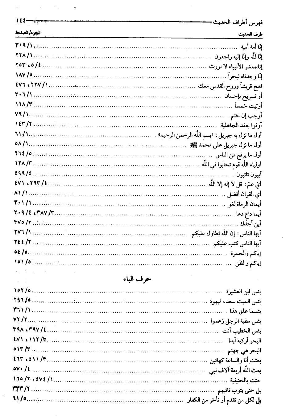 الرحمن الرحيم» : ١/ ٦١ أول ما نزل جبريل على محمد صلى الله عليه وسلّم: ١/ ٥٨ أول ما يرفع من الناس: ٥/ ٢٦٤ أولياء الله قوم تحابوا في الله: ٣/ ١٢٨ آئبون تائبون: ٤/ ٤٩٩ أي عمّ: قل لا إله إلا الله: ٤/ ٢٩٣، ٤٧١ أي القرآن أفضل: ١/ ٨١ أيمان الرماة لغو: ١/ ٣٠١ أيمان داع دعا: ٣/ ٣٨٧، ٤/ ٣٠٩ أين أجدك: ٢/ ٣٧٥ أيها الناس: إن الله تطاول عليكم: ١/ ٢٧٦ أيها الناس كتب عليكم: ٢/ ٢٤٤ إياكم والحمرة: ٥/ ٥٤ إياكم والظن: ٥/ ١٥١ حرف الباء بئس ابن العشيرة: ٥/ ١٥٢ بئس الميت سعد، ليهود: ٥/ ٢٩٦ بئسما علق هذا: ١/ ٣٦١ بئس مطية الرجل زعموا: ٢/ ٧٢ بئس الخطيب أنت: ٤/ ٣٩٧، ٣٩٨ البحر أركبه أبدا: ٣/ ١١٢، ٤٧١ البحر هي جهنم: ٣/ ٥١٣ بعثت أنا والساعة كهاتين: ٣/ ٤١١، ٤٦٣ بعث الله أربعة آلاف نبي: ٤/ ٥٧٠ بعثت بالحنيفية: ١/ ٤٧٤، ٢/ ١٦٥ بل حتى يتوب تائبهم: ٢/ ٣٣٣ بل لكل من تقدم أو تأخر من الكفار: ٥/ ٦١
