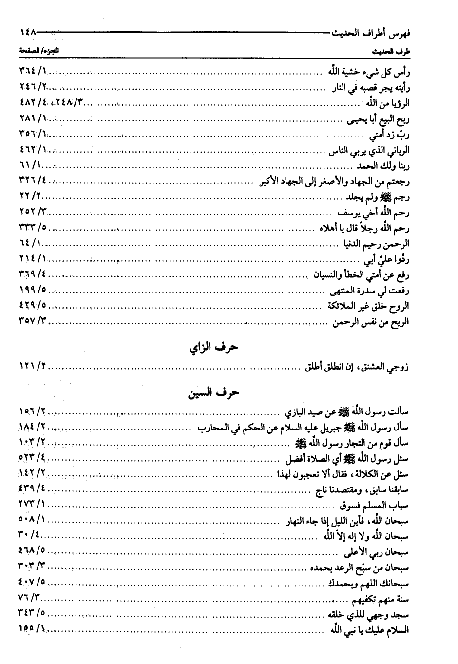 رأس كل شيء خشية الله: ١/ ٣٦٤ رأيته يجر قصبه في النار: ٢/ ٢٤٦ الرؤيا من الله: ٣/ ٢٤٨، ٤/ ٤٨٢ ربح البيع أبا يحيى: ١/ ٢٨١ ربّ زد أمتي: ١/ ٣٥٦ الرباني الذي يربي الناس: ١/ ٤٦٢ ربنا ولك الحمد: ١/ ٦١ رجعتم من الجهاد والأصغر إلى الجهاد الأكبر: ٤/ ٣٢٦ رجم صلى الله عليه وسلّم ولم يجلد: ٢/ ٢٢ رحم الله أخي يوسف: ٣/ ٢٥٢ رحم الله رجلا قال يا أهلاه: ٥/ ٣٣٣ الرحمن رحيم الدنيا: ١/ ٦٤ ردّوا عليّ أبي: ١/ ٢١٤ رفع عن أمتي الخطأ والنسيان: ٤/ ٣٦٩ رفعت لي سدرة المنتهى: ٥/ ١٩٩ الروح خلق غير الملائكة: ٥/ ٤٢٩ الريح من نفس الرحمن: ٣/ ٣٥٧ حرف الزاي زوجي العشنق، إن انطلق أطلق: ٢/ ١٢١ حرف السين سألت رسول الله صلى الله عليه وسلّم عن صيد البازي: ٢/ ١٥٦ سأل رسول الله صلى الله عليه وسلّم جبريل عليه السلام عن الحكم في المحارب: ٢/ ١٨٤ سأل قوم من التجار رسول الله صلى الله