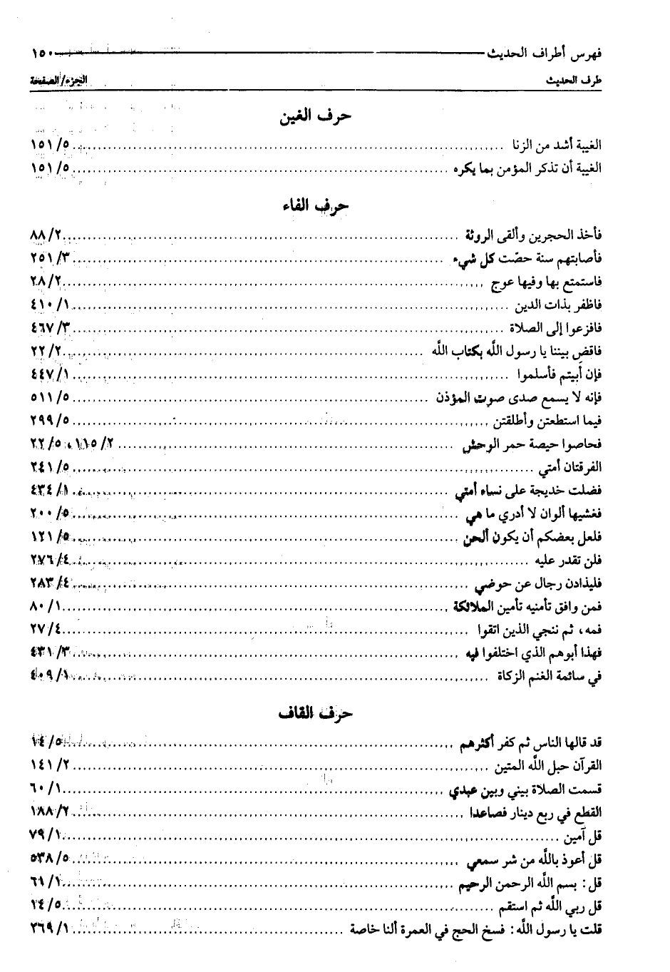 حرف الغين الغيبة أشد من الزنا: ٥/ ١٥١ الغيبة أن تذكر المؤمن بما يكره: ٥/ ١٥١ حرف الفاء فأخذ الحجرين وألقى الروثة: ٢/ ٨٨ فأصابتهم سنة حصّت كل شيء: ٣/ ٢٥١ فاستمتع بها وفيها عوج: ٢/ ٢٨ فاظفر بذات الدين: ١/ ٤١٠ فافزعوا إلى الصلاة: ٣/ ٤٦٧ فاقض بيننا يا رسول الله بكتاب الله: ٢/ ٢٢ فإن أبيتم فأسلموا: ١/ ٤٤٧ فإنه لا يسمع صدى صوت المؤذن: ٥/ ٥١١ فيما استطعتن وأطلقتن: ٥/ ٢٩٩ فحاصوا حيصة حمر الوحش: ٢/ ١١٥، ٥/ ٢٢ الفرقتان أمتي: ٥/ ٢٤١ فضلت خديجة على نساء أمتي: ١/ ٤٣٤ فغشيها ألوان لا أدري ما هي: ٥/ ٢٠٠ فلعل بعضكم أن يكون ألحن: ٥/ ١٢١ فلن تقدر عليه: ٤/ ٢٧٦ فليذادن رجال عن حوضي: ٤/ ٢٨٣ فمن وافق تأمينه تأمين الملائكة: ١/ ٨٠ فمه، ثم ننجي الذين اتقوا: ٤/ ٢٧ فهذا أبوهم الذي اختلفوا فيه: ٣/ ٤٣١ في سائمة الغنم الزكاة: ١/ ٤٠٩ حرف القاف قد قالها الناس ثم كفر أكثرهم: ٥/ ١٤ القرآن حبل الله المتين: ٢/ ١٤١ قسمت الصلاة بيني وبين عبدي: ١/ ٦٠ القطع في ربع دينار فصاعدا: ٢/ ١٨٨ قل آمين: ١/ ٧٩ قل أعوذ بالله من شر سمعي: ٥/ ٥٣٨ قل: بسم الله الرحمن الرحيم: ١/ ٦١ قل ربي الله ثم استقم: ٥/ ١٤ قلت يا رسول الله: فسخ الحج في العمرة ألنا خاصة: ١/ ٢٦٩