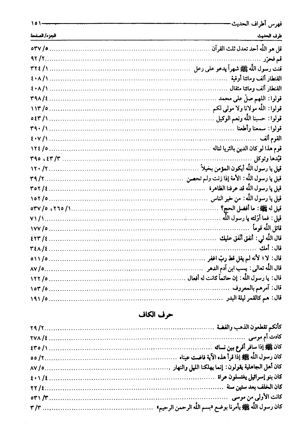 قل هو الله أحد تعدل ثلث القرآن: ٥/ ٥٣٧ ثم فحرّر: ٢/ ٩٢ قنت رسول الله صلى الله عليه وسلّم شهرا يدعو على رعل: ١/ ٣٢٤ القنطار ألف ومائتا أوقية: ١/ ٤٠٨ القنطار ألف ومائتا مثقال: ١/ ٤٠٨ قولوا: اللهم صلّ على محمد: ٤/ ٣٩٨ قولوا: الله مولانا ولا مولى لكم: ٥/ ١١٣ قولوا: حسبنا الله ونعم الوكيل: ١/ ٥٤٣ قولوا: سمعنا وأطعنا: ١/ ٣٩٠ القوم ألف: ١/ ٤٠٧ قوم هذا لو كان الدين بالثريا لناله: ٥/ ١٢٤ قيّدها وتوكل: ٣/ ٤٣، ٣٩٥ قيل يا رسول الله أيكون المؤمن بخيلا: ٢/ ١٢٠ قيل يا رسول الله: الأمة إذا زنت ولم تحصن: ٢/ ٣٩ قيل يا رسول الله قد عرفنا الظاهرة: ٤/ ٣٥٢ قيل يا رسول الله: من خير الناس: ٥/ ١٥٢ قيل له صلى الله عليه وسلّم: ما أفضل الحج؟: ١/ ٢٦٥، ٥/ ٥٣٧ قيل: فما أوّلته يا رسول الله: ١/ ٧١ قاتل الله قوما: ٥/ ١٧٧ قال الله لي: أنفق أنفق عليك: ٤/ ٤٢٣ قال: أمك: ٤/ ٣٤٨ قال: لا لأنه لم يقل قط ربّ اغفر: ٥/ ٥١١ قال الله تعالى: يسب ابن آدم الدهر: ٥/ ٨٧ قال: يا رسول الله: إن حاتما كانت له أفعال: ٥/ ١٢٢ قال: آمرهم بالمعروف: ٥/ ١٥٣ قال: هم كالقمر ليلة البدر: ٥/ ١٩١ حرف الكاف كأنكم تقطعون الذهب والفضة: ٢/ ٢٩ كادت أم موسى: ٤/ ٢٧٨ كان صلى الله عليه وسلّم إذا سافر أقرع بين نسائه: ١/ ٤٣٥ كان رسول الله صلى الله عليه وسلّم إذا قرأ هذه الآية فاضت عيناه: ٢/ ٥٥ كان أهل الجاهلية يقولون: إنما يهلكنا الليل والنهار: ٥/ ٨٧ كان بنو إسرائيل يغتسلون عراة: ٤/ ٤٠١ كان الخلف بعد ستين سنة: ٤/ ٢٢ كانت الأولى من موسى: ٣/ ٥٣١ كان رسول الله صلى الله عليه وسلّم يأمرنا بوضع «بسم الله الرحمن الرحيم» : ٣/ ٣