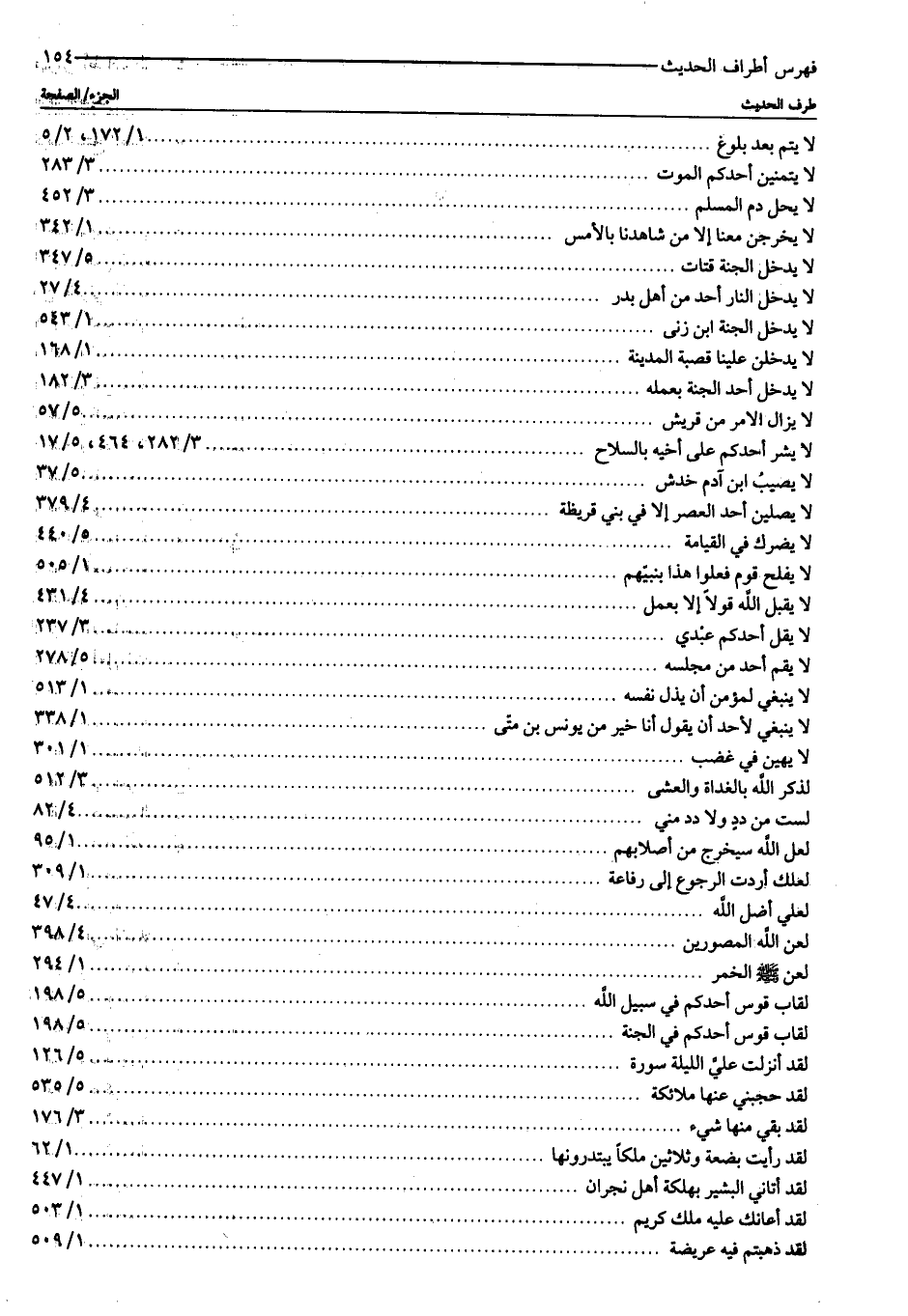 لا يتم بعد بلوغ: ١/ ١٧٢، ٢/ ٥ لا يتمنين أحدكم الموت: ٣/ ٢٨٣ لا يحل دم المسلم: ٣/ ٤٥٢ لا يخرجن معنا إلا من شاهدنا بالأمس: ١/ ٣٤٢ لا يدخل الجنة قتات: ٥/ ٣٤٧ لا يدخل النار أحد من أهل بدر: ٤/ ٢٧ لا يدخل الجنة ابن زنى: ١/ ٥٤٣ لا يدخلن علينا قصبة المدينة: ١/ ١٦٨ لا يدخل أحد الجنة بعمله: ٣/ ١٨٢ لا يزال الأمر من قريش: ٥/ ٥٧ لا يشر أحدكم على أخيه بالسلاح: ٣/ ٢٨٢، ٤٦٤، ٥/ ١٧ لا يصيب ابن آدم خدش: ٥/ ٣٧ لا يصلين أحد العصر إلا في بني قريظة: ٤/ ٣٧٩ لا يضرك في القيامة: ٥/ ٤٤٠ لا يفلح قوم فعلوا هذا بنبيّهم: ١/ ٥٠٥ لا يقبل الله قولا إلا بعمل: ٤/ ٤٣١ لا يقل أحدكم عبدي: ٣/ ٢٣٧ لا يقم أحد من مجلسه: ٥/ ٢٧٨ لا ينبغي لمؤمن أن يذل نفسه: ١/ ٥١٣ لا ينبغي لأحد أن يقول أنا خير من يونس بن متّى: ١/ ٣٣٨ لا يهين في غضب: ١/ ٣٠١ لذكر الله بالغداة والعشى: ٣/ ٥١٢ لست من دد ولا دد مني: ٤/ ٨٢ لعل الله سيخرج من أصلابهم: ١/ ٩٥ لعلك أردت الرجوع إلى رفاعة: ١/ ٣٠٩ لعلي أضل الله: ٤/ ٤٧ لعن الله المصورين: ٤/ ٣٩٨ لعن صلى الله عليه وسلّم الخمر: ١/ ٢٩٤ لقاب قوس أحدكم في سبيل الله: ٥/ ١٩٨ لقاب قوس أحدكم في الجنة: ٥/ ١٩٨ لقد أنزلت عليّ الليلة سورة: ٥/ ١٢٦ لقد حجبني عنها ملائكة: ٥/ ٥٣٥ لقد بقي منها شيء: ٣/ ١٧٦ لقد رأيت بضعة وثلاثين ملكا يبتدرونها: ١/ ٦٢ لقد أتاني البشير بهلكة أهل نجران: ١/ ٤٤٧ لقد أعانك عليه ملك كريم: ١/ ٥٠٣ لقد ذهبتم فيه عريضة: ١/ ٥٠٩