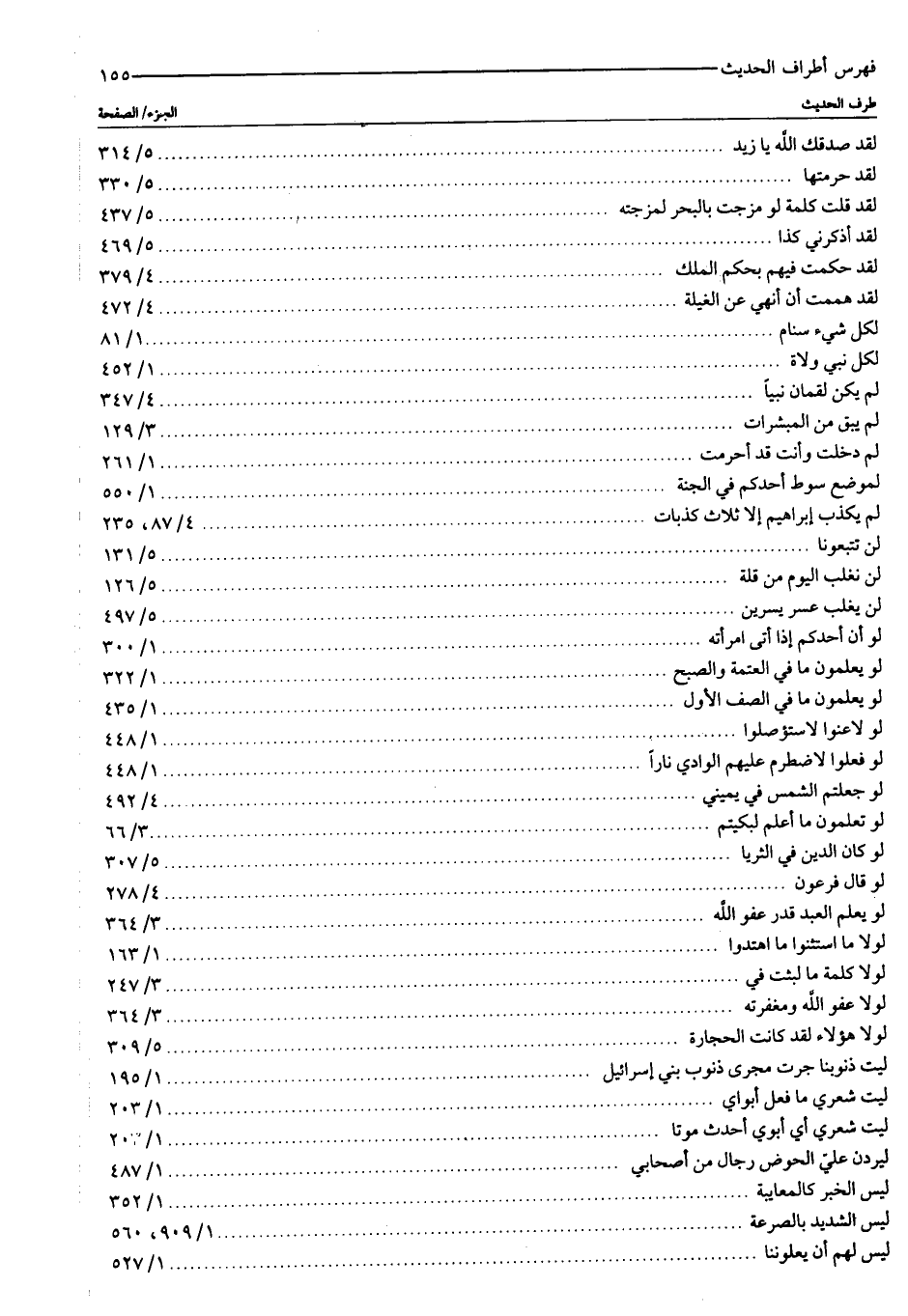 لقد صدقك الله يا زيد: ٥/ ٣١٤ لقد حرمتها: ٥/ ٣٣٠ لقد قلت كلمة لو مزجت بالبحر لمزجته: ٥/ ٤٣٧ لقد أذكرني كذا: ٥/ ٤٦٩ لقد حكمت فيهم بحكم الملك: ٤/ ٣٧٩ لقد هممت أن أنهي عن الغيلة: ٤/ ٤٧٢ لكل شيء سنام: ١/ ٨١ لكل نبي ولاة: ١/ ٤٥٢ لم يكن لقمان نبيا: ٤/ ٣٤٧ لم يبق من المبشرات: ٣/ ١٢٩ لم دخلت وأنت قد أحرمت: ١/ ٢٦١ لموضع سوط أحدكم في الجنة: ١/ ٥٥٠ لم يكذب إبراهيم إلا ثلاث كذبات: ٤/ ٨٧، ٢٣٥ لن تتبعونا: ٥/ ١٣١ لن نغلب اليوم من قلة: ٥/ ١٢٦ لن يغلب عسر يسرين: ٥/ ٤٩٧ لو أن أحدكم إذا أتى امرأته: ١/ ٣٠٠ لو يعلمون ما في العتمة والصبح: ١/ ٣٢٢ لو يعلمون ما في الصف الأول: ١/ ٤٣٥ لولا عنوا لاستؤصلوا: ١/ ٤٤٨ لو فعلوا لاضطرم عليهم الوادي نارا: ١/ ٤٤٨ لو جعلتم الشمس في يميني: ٤/ ٤٩٢ لو تعلمون ما أعلم لبكيتم: ٣/ ٦٦ لو كان الدين في الثريا: ٥/ ٣٠٧ لو قال فرعون: ٤/ ٢٧٨ لو يعلم العبد قدر عفو الله: ٣/ ٣٦٤ لولا ما استثنوا ما اهتدوا: ١/ ١٦٣ لولا كلمة ما لبثت في: ٣/ ٢٤٧ لولا عفو الله ومغفرته: ٣/ ٣٦٤ لولا هؤلاء لقد كانت الحجارة: ٥/ ٣٠٩ ليت ذنوبنا جرت مجرى ذنوب بني إسرائيل: ١/ ١٩٥ ليت شعري ما فعل أبواي: ١/ ٢٠٣ ليت شعري أي أبوي أحدث موتا: ١/ ٢٠٣ ليردن عليّ الحوض رجال من أصحابي: ١/ ٤٨٧ ليس الخبر كالمعايبة: ١/ ٣٥٢ ليس الشديد بالصرعة: ١/ ٩٠٩، ٥٦٠ ليس لهم أن يعلوننا: ١/ ٥٢٧