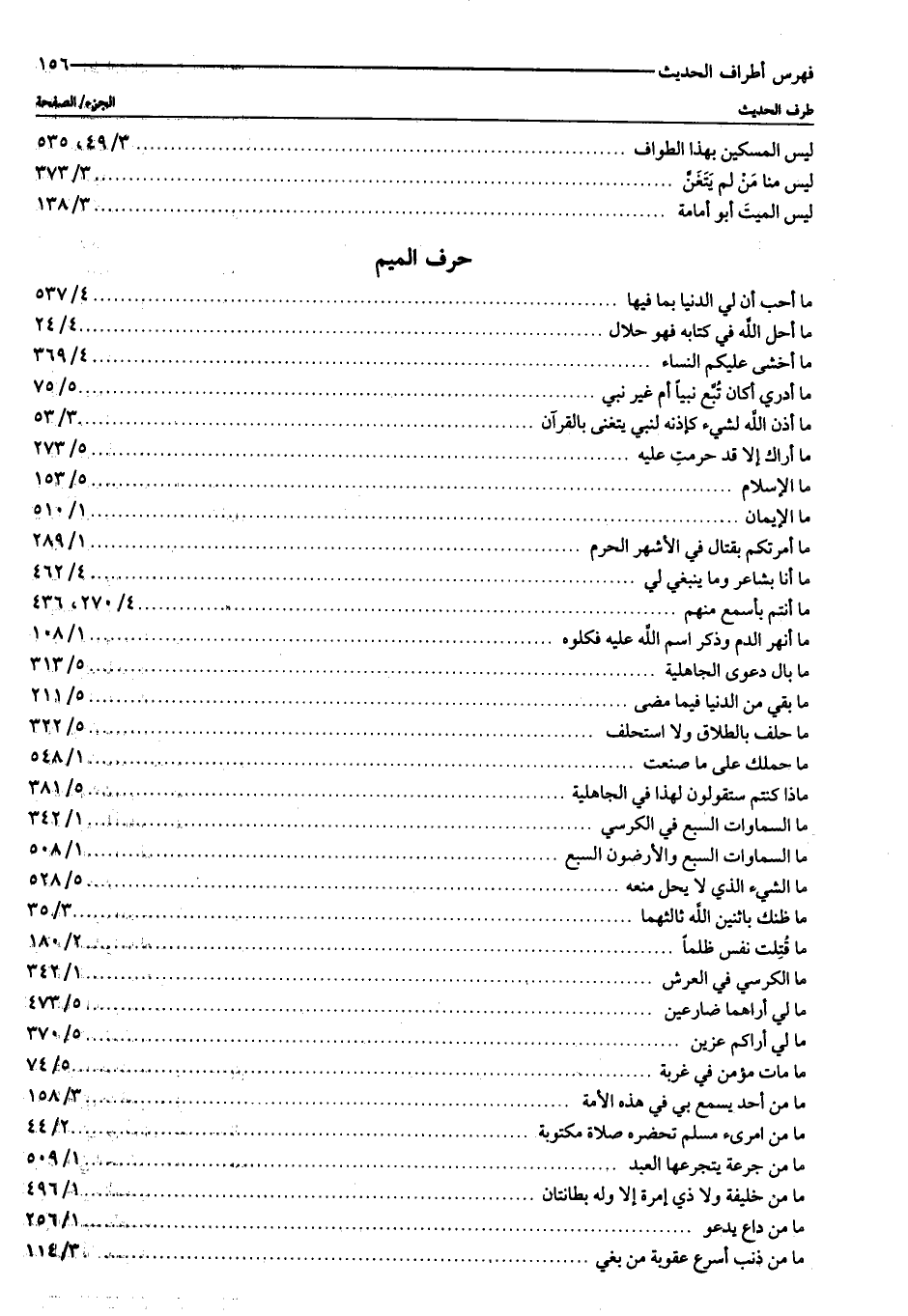 ليس المسكين بهذا الطواف: ٣/ ٤٩، ٥٣٥ ليس منا من لم يتغنّ: ٣/ ٣٧٣ ليس الميت أبو أمامة: ٣/ ١٣٨ حرف الميم ما أحب أن لي الدنيا بما فيها: ٤/ ٥٣٧ ما أحل الله في كتابه فهو حلال: ٤/ ٢٤ ما أخشى عليكم النساء: ٤/ ٣٦٩ ما أدري أكان