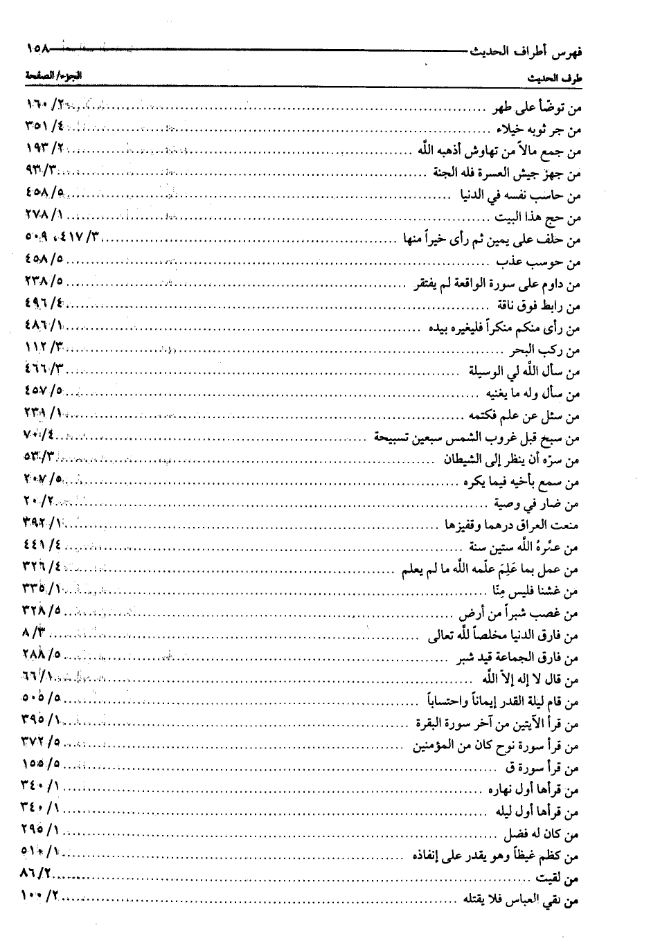 من توضّأ على طهر: ٢/ ١٦٠ من جر ثوبه خيلاء: ٤/ ٣٥١ من جمع مالا من تهاوش أذهبه الله: ٢/ ١٩٣ من جهز جيش العسرة فله الجنة: ٣/ ٩٣ من حاسب نفسه في الدنيا: ٥/ ٤٥٨ من حج هذا البيت: ١/ ٢٧٨ من حلف على يمين ثم رأى خيرا منها: ٣/ ٤١٧، ٥٠٩ من حوسب عذب: ٥/ ٤٥٨ من دوام على سورة الواقعة لم يفتقر: ٥/ ٢٣٨ من رابط فوق ناقة: ٤/ ٤٩٦ من رأى منكم منكرا فليغيره بيده: ١/ ٤٨٦ من ركب البحر: ٣/ ١١٢ من سأل الله لي الوسيلة: ٣/ ٤٦٦ من سأل وله ما يغنيه: ٥/ ٤٥٧ من سئل عن علم فكتمه: ١/ ٢٣١ من سبح قبل غروب الشمس سبعين تسبيحة: ٤/ ٧٠ من سرّه أن ينظر إلى الشيطان: ٣/ ٥٣ من سمع بأخيه فيما يكره: ٥/ ٢٠٧ من ضار في وصية: ٢/ ٢٠ منعت العراق درهما وقفيزها: ١/ ٣٩٢ من عمّره الله ستين سنة: ٤/ ٤٤١ من عمل بما علم علّمه الله ما لم يعلم: ٤/ ٣٢٦ من غشنا فليس منّا: ١/ ٣٣٥ من غصب شبرا من أرض: ٥/ ٣٢٨ من فارق الدنيا مخلصا لله تعالى: ٣/ ٨ من فارق الجماعة قيد شبر: ٥/ ٢٨٨ من قال لا إله إلّا الله: ١/ ٦٦ من قام ليلة القدر إيمانا واحتسابا: ٥/ ٥٠٥ من قرأ الآيتين من آخر سورة البقرة: ١/ ٣٩٥ من قرأ سورة نوح كان من المؤمنين: ٥/ ٣٧٢ من قرأ سورة ق: ٥/ ١٥٥ من قرأها أول نهاره: ١/ ٣٤٠ من قرأها أول ليله: ١/ ٣٤٠ من كان له فضل: ١/ ٢٩٥ من كظم غيظا وهو يقدر على إنفاذه: ١/ ٥١٠ من لقيت: ٢/ ٨٦ من لقي العباس فلا يقتله: ٢/ ١٠٠