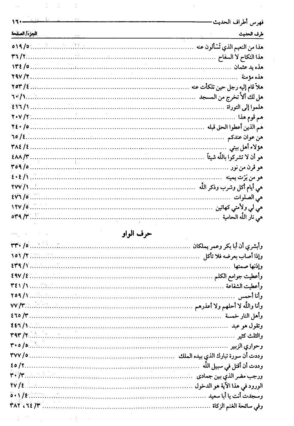 هذا من النعيم الذي تسألون عنه: ٥/ ٥١٩ هذا النكاح لا السفاح: ٢/ ٣٦ هذه يد عثمان: ٥/ ١٣٤ هذه مؤمنة: ٢/ ٢٩٧ هلّا قام إليه رجل حين تلكأت عنه: ٤/ ٢٥٣ هل لك ألّا تخرج من المسجد: ١/ ٦٠ هلموا إلى التوراة: ١/ ٤١٦ هم قوم هذا: ٢/ ٢٠٧ هم الذين أعطوا الحق قبله: ٥/ ٢٤٠ هن عوان عندكم: ٤/ ٦٥ هؤلاء أهل بيتي: ٤/ ٣٨٤ هو أن لا تشركوا بالله شيئا: ٣/ ٤٨٨ هو قرن من نور: ٥/ ٣٥٩ هو من برّت يمينه: ١/ ٤٠٤ هي أيام أكل وشرب وذكر الله: ١/ ٢٧٧ هي الصلوات: ٥/ ٤٧٦ هي لي ولأمتي كهاتين: ٥/ ١٢٧ هي نار الله الحامية: ٣/ ٥٣٩ حرف الواو وأبشري أن أبا بكر وعمر يملكان: ٥/ ٣٣٠ وإذا أصاب بعرضه فلا تأكل: ٢/ ١٥١ وإذنها صمتها: ١/ ٤٣٩ وأعطيت جوامع الكلم: ٤/ ٤٩٧ وأعطيت الشفاعة: ١/ ٣٤١ وأنا أحمس: ١/ ٢٥٩ وأنا والله لا أحلهم ولا أعذرهم: ٣/ ٧٧ وأهل النار خمسة: ٣/ ٤٦٥ وتقول هو عبد: ١/ ٤٤٦ والثلث كثير: ٢/ ٣٩٣ وحواري الزبير: ٥/ ٣٠٥ وددت أن سورة تبارك الذي بيده الملك: ٥/ ٣٧٧ وددت أن أقتل في سبيل الله: ٢/ ٤٥ ورجب مضر الذي بين جمادى: ٣/ ٣٠ الورود في هذا الآية هو الدخول: ٤/ ٢٧ وسجدت أنت يا أبا سعيد: ٤/ ٥٠١ وفي سائحة الغنم الزكاة: ٣/ ٦٤، ٣٨٢