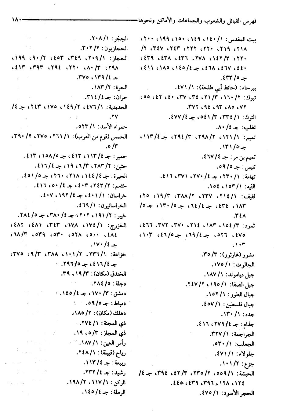 بيت المقدس: ١/ ١٤٠، ١٤٩، ١٥٠، ١٩٩، ٢٠٠، ٢١٨، ٢١٩، ٢٢٠، ٢٢٢، ٢٤٣، ٣٤٧، ٢/ ٢٢٠، ٣/ ١٤٢، ٢٧٨، ٤٣٦، ٤٣٨، ٤٣٩، ٤٤٠، ٤٦٧، ٤٦٨، ج ٤/ ١٤٥، ١٨٥، ٤١١، ج ٥/ ٤٣٣.