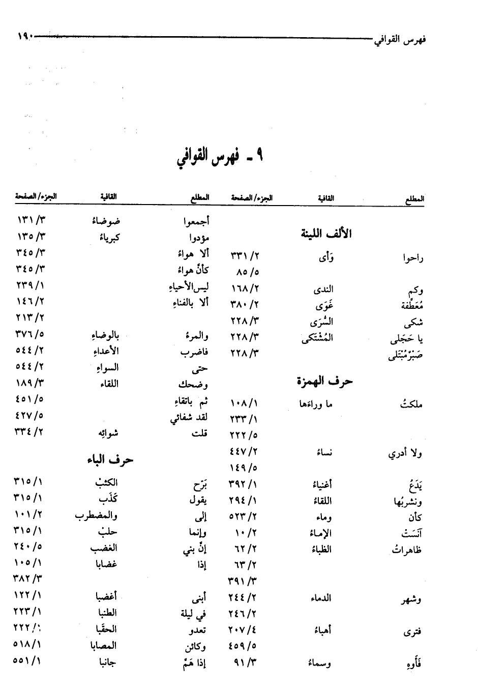 المطلع: القافية: الجزء/ الصفحة الألف اللينة راحوا: وأى: ٢/ ٣٣١ ٥/ ٨٥ وكم: الندى: ٢/ ١٦٨ معطّفة: غوى: ٢/ ٣٨٠ شكى: السّرى: ٣/ ٢٢٨ يا حجلى: المشتكى: ٣/ ٢٢٨ صبر مبتلى: ٣/ ٢٢٨ حرف الهمزة ملكت: ما وراءها: ١/ ١٠٨ ١/ ٢٣٣ ٥/ ٢٢٢ ولا أدري: نساء: ٢/ ٤٤٧ ٥/ ١٤٩ يدع: أغنياء: ١/ ٣٩٢ ونشربها: اللقاء: ١/ ٢٩٤ كأن: وماء: ٢/ ٥٢٣ آنست: الإماء: ٢/ ١٠ ظاهرات: الظباء: ٢/ ٦٢ ٢/ ٦٣ ٣/ ٣٩١ وشهر: الدماء: ٢/ ٢٤٤ ٢/ ٢٤٦ فترى: أهباء: ٤/ ٢٠٧ ٥/ ٤٥٩ فأوه: وسماء: ٣/ ٩١ أجمعوا: ضوضاء: ٣/ ١٣١ مؤدوا: كبرياء: ٣/ ١٣٥ ألا هواء: ٣/ ٣٤٥ كأنّ هواء: ٣/ ٣٤٥ ليس الأحياء: ١/ ٢٣٩ ألا بالفناء: ٢/ ١٤٦ ٢/ ٢١٣ والمرء: بالوضاء: ٥/ ٣٧٦ فاضرب: الأعداء: ٢/ ٥٤٤ حتى: السواء: ٢/ ٥٤٤ وضحك: اللقاء: ٣/ ١٨٩ ثم باتقاء: ٥/ ٤٥١ لقد شفائي: ٥/ ٤٢٧ قلت: شوائه: ٢/ ٣٣٤ حرف الباء برّح: الكثب: ١/ ٣١٥ يقول: كذب: ١/ ٣١٥ إلى: والمضطرب: ٢/ ١٠١ وإنما: حلب: ١/ ٣١٥ إنّ بني: الغضب: ٥/ ٢٤٠ إذا: غضابا: ١/ ١٠٥ ٣/ ٣٨٢ أبنى: أغضبا: ١/ ١٢٢ في ليلة: الطنبا: ١/ ٢٢٣ تعدو: الحقبا: ١/ ٢٢٢ وكائن: المصابا: ١/ ٥١٨ إذا همّ: جانبا: ١/ ٥٥١