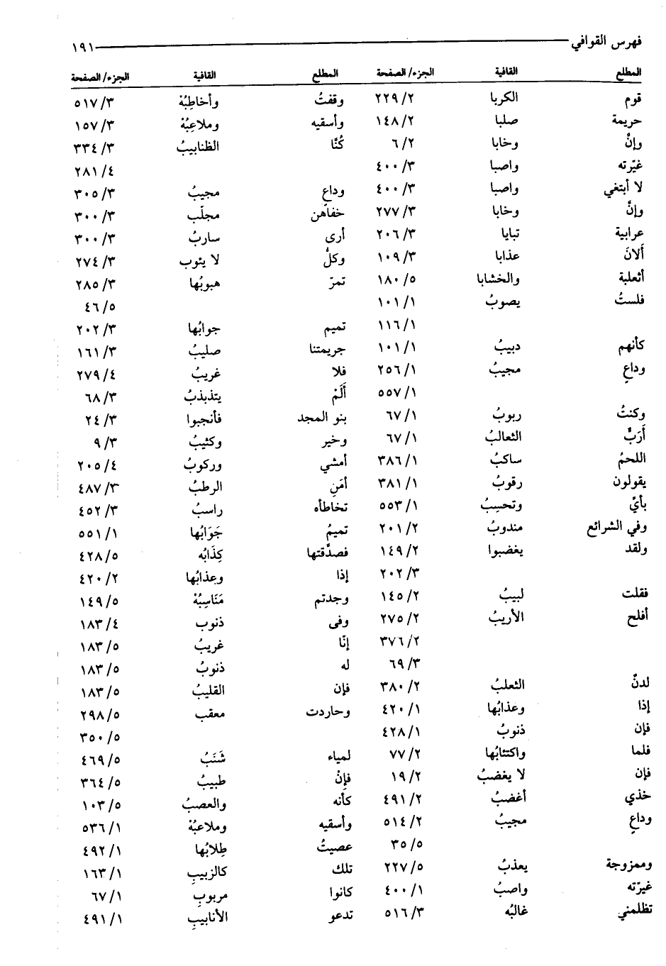 قوم: الكربا: ٢/ ٢٢٩ حريمة: صلبا: ٢/ ١٤٨ وإنّ: وخابا: ٢/ ٦ غيّرته: واصبا: ٣/ ٤٠٠ لا أبتغي: واصبا: ٣/ ٤٠٠ وإنّ: وخابا: ٣/ ٢٧٧ عرابية: تبايا: ٣/ ٢٠٦ ألان: عذابا: ٣/ ١٠٩ أثعلبة: والخشابا: ٥/ ١٨٠ فلست: يصوب: ١/ ١٠١ ١/ ١١٦ كأنهم: دبيب: ١/ ١٠١ وداع: مجيب: ١/ ٢٥٦ ١/ ٥٥٧ وكنت: ربوب: ١/ ٦٧ أربّ: الثعالب: ١/ ٦٧ اللحم: ساكب: ١/ ٣٨٦ يقولون: رقوب: ١/ ٣٨١ بأيّ: وتحسب: ١/ ٥٥٣ وفي الشرائع: مندوب: ٢/ ٢٠١ ولقد: يغضبوا: ٢/ ١٤٩ ٣/ ٢٠٢ فقلت: لبيب: ٢/ ١٤٥ أفلح: الأريب: ٢/ ٢٧٥ ٢/ ٣٧٦ ٣/ ٦٩ لدنّ: الثعلب: ٢/ ٣٨٠ إذا: وعذابها: ١/ ٤٢٠ فإن: ذنوب: ١/ ٤٢٨ فلما: واكتئابها: ٢/ ٧٧ فإن: لا يغضب: ٢/ ١٩ خذي: أغضب: ٢/ ٤٩١ وداع: مجيب: ٢/ ٥١٤ ٥/ ٣٥ وممزوجة: يعذب: ٥/ ٢٢٧ غيرّته: واصب: ١/ ٤٠٠ تظلمني: غالبه: ٣/ ٥١٦ وقفت: وأخاطبه: ٣/ ٥١٧ وأسقيه: وملاعبه: ٣/ ١٥٧ كنّا: الظنابيب: ٣/ ٣٣٤ ٤/ ٢٨١ وداع: مجيب: ٣/ ٣٠٥ خفاهن: مجلّب: ٣/ ٣٠٠ أرى: سارب: ٣/ ٣٠٠ وكلّ: لا يئوب: ٣/ ٢٧٤ تمرّ: هبوبها: ٣/ ٢٨٥ ٥/ ٤٦ تميم: جوابها: ٣/ ٢٠٢ جريمتنا: صليب: ٣/ ١٦١ فلا: غريب: ٤/ ٢٧٩ ألم: يتذبذب: ٣/ ٦٨ بنو المجد: فأنجبوا: ٣/ ٢٤ وخير: وكثيب: ٣/ ٩ أمشي: وركوب: ٤/ ٢٠٥ أمن: الرطب: ٣/ ٤٨٧ تخاطأه: راسب: ٣/ ٤٥٢ تميم: جوابها: ١/ ٥٥١ فصدّقتها: كذابه: ٥/ ٤٢٨ إذا: وعذابها: ٢/ ٤٢٠ وجدتم: مناسبه: ٥/ ١٤٩ وفى: ذنوب: ٤/ ١٨٣ إنّا: غريب: ٥/ ١٨٣ له: ذنوب: ٥/ ١٨٣ فإن: القليب: ٥/ ١٨٣ وحاردت: معقب: ٥/ ٢٩٨ ٥/ ٣٥٠ لمياء: شنب: ٥/ ٤٦٩ فإن: طبيب: ٥/ ٣٦٤ كأنه: والعصب: ٥/ ١٠٣ وأسقيه: وملاعبه: ١/ ٥٣٦ عصيت: طلابها: ١/ ٤٩٢ تلك: كالزبيب: ١/ ١٦٣ كانوا: مربوب: ١/ ٦٧ تدعو: الأنابيب: ١/ ٤٩١