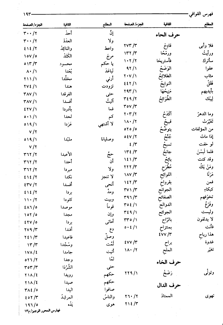 حرف الحاء فلا وأبى: قادح: ٣/ ٢٧٣ ورأيت: ورمحا: ٣/ ١٣٢ سأترك: فأستريحا: ٢/ ١٠٢ عقوا: الوضح: ١/ ٩٢ مثاب: الطلائح: ١/ ٢٠٧ فقل: النوابح: ١/ ٤٤٢ بأيديهم: منيحها: ١/ ٢٩٣ ليبك: الطّوائح: ٢/ ٣٤٩ ٣/ ٣٥٧ وما الدهر: أكدح: ٢/ ٢٠٣ تغيّرت: قبيح: ٢/ ١٨٠ من المؤلفات: يتوضّح: ٥/ ٥٢٥ إذا مات: جنّح: ٢/ ٥٤٧ لو خفت: تسبح: ٣/ ٤ فلما لبسن: جانح: ٣/ ١٣٤ وقد كنت: بائح: ٣/ ١٤١ ومن يك: مطّرح: ٣/ ٢٢٢ مرنا: اللوائح: ٣/ ١٨٧ فمن: بقرواح: ٣/ ١٤٢ كبكاء: الجوانح: ٣/ ٣٧١ تخوّفهم: الصفائح: ٣/ ٣٩٦ وفرع: الدوالح: ١/ ٣٥٤ وليست: الجوائح: ١/ ٣٤٩ لا يدلفون: بالرّاح: ١/ ٣٣٥ فأنت: بمنتزاح: ١/ ٥٠٤ هذا رباح: ٣/ ٤٧٧ غدوة: براح: ٣/ ٤٧٧ تغيّر: الملح: ٢/ ١٨٠ حرف الخاء وتولى: رضخ: ١/ ٢٢٩ حرف الدال تهوى: الممتاد: ٢/ ٢٦٠ ٣/ ٢١٤ إنّ: أحد: ٢/ ٣٠٠ ولا: العدد: ٢/ ٣٠٠ واعط: والناكد: ٢/ ٤١٤ مرج: الكتد: ٥/ ١٥٧ يا حكم: محسود: ٣/ ٥١٣ تباعد: بعدا: ١/ ٨٠ أرني: مخلّدا: ١/ ٢١١ تزودت: هندا: ١/ ٢٧٤ حتى: الفرقدا: ١/ ٣٨٧ آليت: أفسدا: ١/ ٣٨٧ فما: بأدردا: ١/ ٤٢٧ كم: لحدا: ١/ ٥٠١ لا أشتهي: عردا: ١/ ٥١٩ ٢/ ٧ وصليانا: ملبّدا: ١/ ٥١٩ ٢/ ٧ حجّ: الأعبدا: ٢/ ٣٦٢ أن: أحدا: ٢/ ٣٦٢ ولا: مبردا: ٢/ ٣٦٢ لا تنجز: نكدا: ٢/ ٤١٤ أنحى: أفسدا: ٢/ ٤٣٧ ومدّ: بردا: ٢/ ٤١٤ وبيت: كئودا: ٢/ ١١٠ قوما: موصدا: ٥/ ٤٨٦ وإن: مجدا: ٥/ ١٥٢ أماتى: بردا: ٥/ ٤٢٧ دع: أفندا: ٣/ ٢٧٩ وصلّ: فاعبدا: ٣/ ٢٤١ ثمّت: وسجّدا: ٣/ ١٣ أتيت: جامدا: ٤/ ١٧٨ لمّا: وجدا: ٢/ ٥٢٦ حتى: الشّردا: ٣/ ٣٥٣ حكهم: رويدا: ٤/ ٢١٨ حكهم: صيدا: ٤/ ٢١٨ صافوا: اليدا: ٥/ ٣٨٤ والناس: المرشد: ٣/ ٤٥٢ هوى: يده: ٥/ ١٩٦