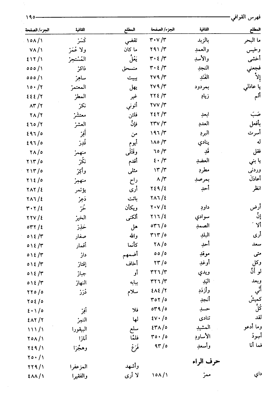 ما البحر: بالزبد: ٣/ ٣٠٧ وخيس: والعمد: ٣/ ٢٩١ أخشى: والأسد: ٣/ ٣٠٤ فجعني: النجد: ٣/ ٣٠٤ إلّا: الفند: ٣/ ٢٧٩ يا عاذلي: بمردود: ٣/ ٢٧٩ ألم: زياد: ٣/ ٢٢٤ ٣/ ٢٧٧ صب: ابعد: ٣/ ٢٤٢ بأفعل: العدد: ٣/ ٢٣٧ أسرت: البرد: ٣/ ١٩٦ له: ينادي: ٣/ ١٨٥ فقل: قد: ٣/ ٦٥ يا بني: العضد: ٣/ ٤٠ وردنى: مطرد: ٣/ ١٣ أعاذل: بمرصد: ٣/ ٨ انظر: أحد: ٤/ ٢٤٩ ٤/ ٢٨٦ أرض: داود: ٤/ ٢٠٧ إنّ: سوادي: ٤/ ٢١٦ ألا: الصمد: ٥/ ٥٣٦ أرى: البلد: ٥/ ٣١٣ سعد: أحد: ٥/ ٢٨ متى: موقد: ٥/ ٥٥ وكل: أوغد: ٥/ ٢٣ لو أنّ: ويدي: ٣/ ٣٢٦ وبعد: اليد: ٣/ ٣٢٦ أنّي: وأزدد: ٢/ ٤٨٤ كميش: أنجد: ٥/ ٣٥٢ كلّ: حسد: ٥/ ٥٣٩ لقد: تنادى: ٥/ ٤٧٠ وما أدعو: المشيد: ٥/ ٤٣٨ أسود: الأساود: ٥/ ٣٥٠ فما أنا: وأسعد: ٥/ ٩٣ حرف الراء داي: ممز: ١/ ١٥٨ تقضي: كسر: ١/ ١٥٨ ما كان: ولا عمر: ١/ ٧٨ يعلّ: المستحر: ١/ ٤١٢ منسحق: ذاكر: ١/ ٥٥٥ يبيت: ساهر: ١/ ٥٥٥ يهل: المعتمر: ٢/ ١٥٠ غير: المطر: ٢/ ٤٤٤ أتوني: نكر: ٢/ ٨٣ فلئن: معتشر: ٢/ ٢٨ فإنّ: العشر: ٢/ ٤٦٥ من: أفر: ٥/ ٤٩٦ أيوم: قدر: ٥/ ٤٩٦ وقتلى: منهمر: ٥/ ٢٨ أقدم: نكر: ٥/ ٢١٣ مثلى: ويكر: ٥/ ٢١٣ راح: منهمر: ٥/ ٢١٤ أرى: يؤتمر: ٤/ ٢٨٢ باتت: دعر: ٤/ ٢٨٦ ويكأن: خرّ: ٤/ ٣٠٢ ألكنى: الخير: ٤/ ٢٢٧ هل: حذر: ٤/ ٥٣٢ والله: صفار: ٣/ ٥١٤ كأنما: أقمار: ٣/ ٥١٤ تضمهم: دار: ٣/ ٥١٤ أخاف: إقتار: ٣/ ٥١٤ أو: جبار: ٣/ ٥١٤ ببابه: النهار: ٣/ ٥١٤ سلام: درر: ٥/ ٢٢٥ ٥/ ٢٥٤ فلا: أفر: ٥/ ٤٠١ لها: النمر: ٢/ ٤٨٢ سلع: البيقورا: ١/ ١١١ فلمّا: أنارا: ١/ ٢٥٨ فرع: وهجّرا: ١/ ٢٤٩ ١/ ٢٥٠ وأشهد: المزعفرا: ١/ ٢٢٩ لا أرى: والفقيرا: ١/ ٤٨٨