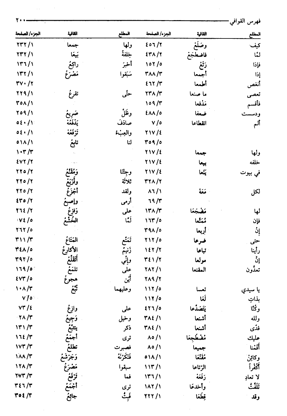 كيف: وصلع: ٢/ ٤٥٦ لمّا: فاضطجع: ٢/ ٤٣٨ فإذا: رتع: ٥/ ١٥٢ إذا: أجمعا: ٣/ ٣٨٨ أنغص: أطمعا: ٣/ ٤٦٢ تعصى: ما صنعا: ٣/ ٢٣٨ فأقسم: مدفعا: ٣/ ١٥٩ ودسست: ضعفا: ٥/ ٤٨٨ ألم: انقطاعا: ٥/ ٧ ٤/ ٢١٧ ٥/ ٣٥٩ ولها: جمعا: ٤/ ٢١٧ خلفه: بيعا: ٤/ ٢١٧ في بيوت: ينعا: ٤/ ٢١٧ ٢/ ٣٢٨ لكل: معه: ١/ ٨٦ ٣/ ٦٩ لها: مضجعا: ٣/ ١٣٨ فإن: ممنّعا: ٥/ ١٦٣ إن: أربعا: ٥/ ٣٩٨ حتى: ضرعا: ٥/ ٢١٢ رأينا: تباعا: ٢/ ١٤٢ إنّ: مولعا: ٢/ ٣٤١ تعدّون: المقنعا: ١/ ٢٨٢ ٢/ ٢٨٩ يا سيدي: تعسا: ٥/ ١١٢ بذات: لعا: ٥/ ١١٢ وكنّا: يتصدّعا: ٥/ ٤٢٦ ولله: أشنعا: ١/ ٣٨٤ فدى: أشنعا: ١/ ٣٨٤ عليك: مضطجعا: ١/ ٨٥ أقمنا: جميعا: ١/ ٨٥ وكائن: مقنّعا: ١/ ٥١٨ أكفرا: الرّتاعا: ١/ ١١٣ لا تعاد: رفعه: ١/ ١٣٦ تلفّت: وأخدعا: ١/ ١٨٢ وقد: قطعا: ١/ ٢٢٢ ولها: جمعا: ١/ ٢٣٢ خلفة: بيعا: ١/ ٢٣٢ أخبر: راكع: ١/ ١٣٦ سبقوا: مصرع: ١/ ١٣٢ ٢/ ٣٧٠ حتّى: تقرع: ١/ ٢٢٩ ١/ ٣٥٨ وظلّ: صريع: ١/ ٢٥٩ صادف: يدفعه: ١/ ٥٤٠ والعبء: ترفعه: ١/ ٥٤٠ لنا: تابع: ١/ ٥١٨ ٣/ ١٠٣ ٢/ ٤٧٢ وجئنا: ومقنّع: ٢/ ٢٢٥ ثلاثة: وأربع: ٢/ ٢٢٥ ولقد: أجزع: ٢/ ٢٢٥ أرمى: وإصبع: ٢/ ٤٣٥ على: وازع: ٢/ ٢٦٤ لمّا: الخشّع: ٥/ ٧٤ ٥/ ٢٦٢ تمتّع: المتاع: ٣/ ٣١١ زنيم: الأكارع: ٥/ ٣٤٨ وإنّي: أتقلّع: ٥/ ٣٩٢ على: تلمع: ٥/ ١٦٩ أين: هجوع: ٥/ ٤٧٣ وعليهما: تبّع: ٣/ ١٠٨ ٥/ ٧ على: وازع: ٤/ ٧٣ وخيل: وجيع: ٣/ ٢٨ ذكر: يتتبّع: ٣/ ١٣١ ترى: أجمع: ٣/ ١٦٤ فصبرت: تطلع: ٣/ ١٧٣ فنكرنه: وجرشع: ٣/ ١٨٨ سبقوا: مصرع: ٣/ ١٢٨ فما: ترفع: ٣/ ٢٧٣ ترى: أجمع: ٣/ ٣٤٦ فبتّ: جائع: ٣/ ٣٥٤