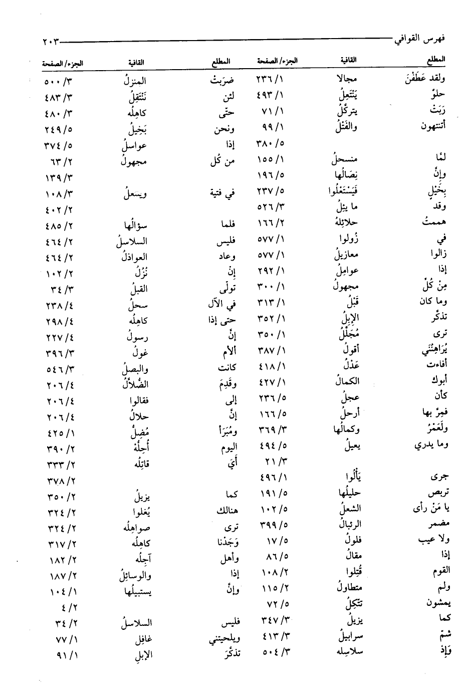 ولقد عطفن: مجالا: ١/ ٢٣٦ حلو: ينتعل: ١/ ٤٩٣ ربت: يتركّل: ١/ ٧١ أتنتهون: والفتل: ١/ ٩٩ ٥/ ٣٨٠ لمّا: منسحل: ١/ ١٥٥ وإنّ: نصالها: ٥/ ١٩٦ بخيل: فيستعلوا: ٥/ ٢٣٧ وقد: ما يئل: ٣/ ٥٢٦ هممت: حلائله: ٢/ ١٦٦ في: زولوا: ١/ ٥٧٧ زالوا: معازيل: ١/ ٥٧٧ إذا: عوامل: ١/ ٢٩٢ من كلّ: مجهول: ١/ ٣٠٠ وما كان: قبل: ١/ ٣١٣ تذكّر: الإبل: ١/ ٣٥٢ ترى: مجلّل: ١/ ٣٥٠ يراهنني: أقول: ١/ ٣٨٧ أفاءت: عدل: ١/ ٤١٨ أبوك: الكمال: ١/ ٤٢٧ كأن: عجل: ٥/ ٢٣٦ فمرّ بها: أرحل: ٥/ ١٦٦ ولعمر: وكمالها: ٣/ ٣٦٩ وما يدري: يعيل: ٥/ ٤٩٤ ٣/ ٢١ جرى: يألوا: ١/ ٤٩٦ تربص: حليلها: ٥/ ١٩١ يا من رأى: الشعل: ٥/ ١٠٢ مضمر: الرئبال: ٥/ ٣٩٩ ولا عيب: فلول: ٥/ ١٧ إذا: مقال: ٥/ ٨٦ القوم: قتلوا: ٢/ ١٠٨ ولم: متطاول: ٢/ ١١٥ يمشون: تتكل: ٥/ ٧٢ كما: يزيل: ٣/ ٣٤٧ شمّ: سرابيل: ٣/ ٤١٣ وإذ: سلاسله: ٣/ ٥٠٤ ضربت: المنزل: ٣/ ٥٠٠ لئن: ننتقل: ٣/ ٤٨٣ حتّى: كاهله: ٣/ ٤٨٠ ونحن: بخيل: ٥/ ٢٤٩ إذا: عواسل: ٥/ ٣٧٤ من كل: مجهول: ٢/ ٦٣ ٣/ ١٣٩ في فتية: ويسعل: ٣/ ١٠٨ ٢/ ٤٠٢ فلما: سؤالها: ٢/ ٤٨٥ فليس: السلاسل: ٢/ ٤٦٤ وعاد: العواذل: ٢/ ٤٦٤ إن: نزل: ٢/ ١٠٢ تولّى: القبل: ٣/ ٣٤ في الآل: سحل: ٤/ ٢٣٨ حتى إذا: كاهله: ٤/ ٢٩٨ إنّ: رسول: ٤/ ٢٢٧ ألأم: غول: ٣/ ٣٩٦ كانت: والبصل: ٣/ ٥٤٦ وقدم