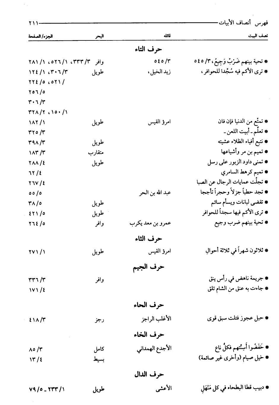 حرف التاء تحية بينهم ضرب وجيع، ٣/ ٥٤٥: ٣/ ٥٤٥: وافر: ٣/ ٣٣٣، ١/ ٥٢٦، ١/ ٢٨١ ترى الأكم فيه سجّدا للحوافر،: زيد الخيل،: طويل: ٣/ ٣٠٦، ١/ ١٢٤/ ٥٢١، ٥/ ٢٢٤ ٥/ ٢٥٦ ٣/ ٣٠٦ ١/ ١٥٠، ٢/ ٣٢٨ تمتّع من الدنيا فإن فان: امرؤ القيس: طويل: ١/ ١٨٢ تعلّم- أبيت اللعن-: ٣/ ٣٢٥ نتبع أفياء الظلاء عشيته: طويل: ٣/ ٣٩٨ تميم بن مر وأشياعها: متقارب: ٣/ ١٨٣ تمنى داود الزبور على رسل: طويل: ٤/ ٢٨٨ تميم كرهط السامري: ٤/ ٦٢ تجلّت عمايات الرجال عن الصبا: ٤/ ٢٦٧ تجد حطبا جزلا وحجرا تأججا: عبد الله بن الحر: ٥/ ٥٥ تقضى لبانات ويسأم سائم: طويل: ٥/ ٣٨ ترى الأكم فيها سجدا للحوافر: طويل: ٥/ ٤٢١ تحية بينهم ضرب وجيع: عمرو بن معد يكرب: وافر: ٥/ ٢٦٤ حرف الثاء ثلاثون شهرا في ثلاثة أحوال: امرؤ القيس: طويل: ١/ ٢٧١ حرف الجيم جريمة ناهض في رأس ينق: وافر: ٣/ ٣٣٦ جاءت به عنق من الشام تلق: ٤/ ١٧١ حرف الحاء حبل عجوز فتلت سبق قوى: الأغلب الراجز: رجز: ٣/ ٤١٨ حرف الخاء خفضوا أسنّتهم فكلّ ناع: الأجدع الهمداني: كامل: ٣/ ٨٥ خيل صيام (وأخرى غير صائمة) : بسيط: ٤/ ١٣ حرف الدال دبيب قطا البطحاء في كل منهل: الأعشى: طويل: ١/ ٢٣٣- ٥/ ٧٩