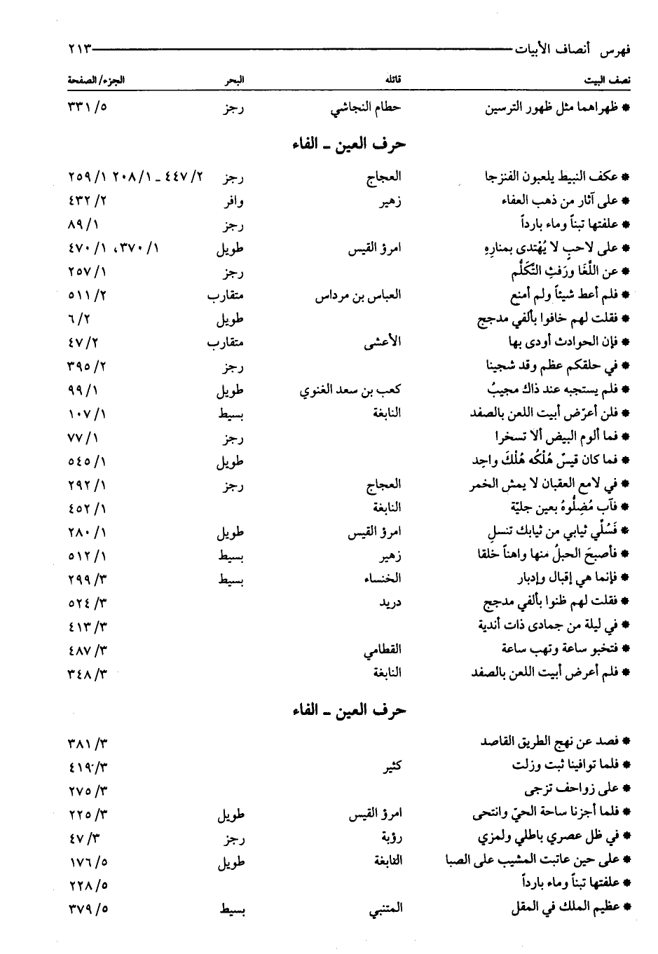 من ذهب العفاء: زهير: وافر: ٢/ ٤٣٢ علفتها تبنا وماء باردا: رجز: ١/ ٨٩ على لاحب لا يهتدى بمناره: امرؤ القيس: طويل: ١/ ٣٧٠، ١/ ٤٧٠ عن اللّغا ورفث التّكلّم: رجز: ١/ ٢٥٧ فلم أعط شيئا ولم أمنع: العباس بن مرداس: متقارب: ٢/ ٥١١ فقلت لهم خافوا بألفي مدجج: طويل: ٢/ ٦ فإن الحوادث أودى بها: الأعشى: متقارب: ٢/ ٤٧ في حلقكم عظم وقد شجينا: رجز: ٢/ ٣٩٥ فلم يستجبه عند ذاك مجيب: كعب بن سعد الغنوي: طويل: ١/ ٩٩ فلن أعرّض أبيت اللعن بالصفد: النابغة: بسيط: ١/ ١٠٧ فما ألوم البيض ألا تسخرا: رجز: ١/ ٧٧ فما كان قيس هلكه هلك واحد: طويل: ١/ ٥٤٥ في لا مع العقبان لا يمش الخمر: العجاج: رجز: ١/ ٢٩٢ فآب مضلّوه بعين جليّة: النابغة: ١/ ٤٥٢ فسلّي ثيابي من ثيابك تنسل: امرؤ القيس: طويل: ١/ ٢٨٠ فأصبح الحبل منها واهنا خلقا: زهير: بسيط: ١/ ٥١٢ فإنما هي إقبال وإدبار: الخنساء: بسيط: ٣/ ٢٩٩ فقلت لهم ظنوا بألفي مدجج: دريد: ٣/ ٥٢٤ في ليلة من جمادى ذات أندية: ٣/ ٤١٣ فتخبو ساعة وتهب ساعة: القطامي: ٣/ ٤٨٧ فلم أعرض أبيت اللعن بالصفد: النابغة: ٣/ ٣٤٨ حرف العين- الفاء فصد عن نهج الطريق القاصد: ٣/ ٣٨١ فلما توافينا ثبت وزلت: كثير: ٣/ ٤١٩ على زواحف تزجى: ٣/ ٢٧٥ فلما أجزنا ساحة الحيّ وانتحى: امرؤ القيس: طويل: ٣/ ٢٢٥ في ظل عصري باطلي ولمزي: رؤبة: رجز: ٣/ ٤٧ على حين عاتبت المشيب على الصبا: النابغة: طويل: ٥/ ١٧٦ علفتها تبنا وماء باردا: ٥/ ٢٢٨ عظيم الملك في المقل: المتنبي: بسيط: ٥/ ٣٧٩
