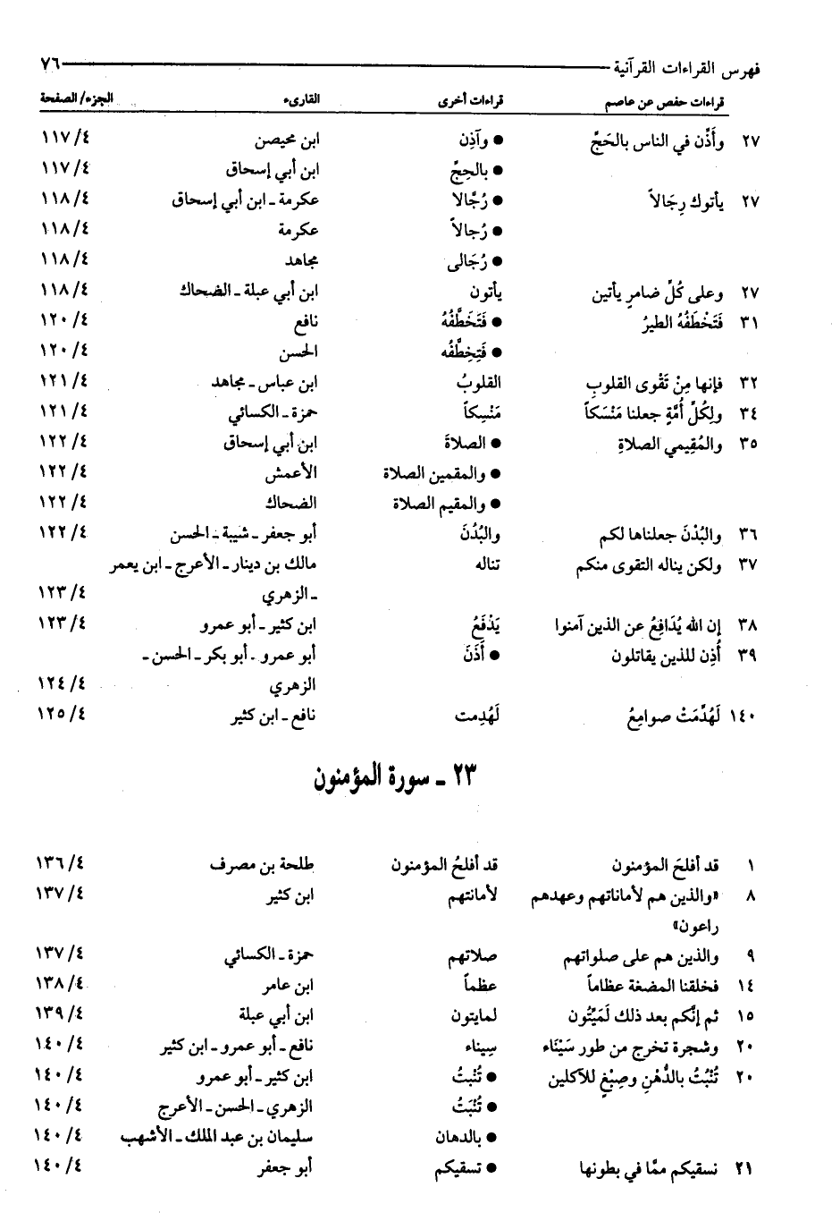١: قَدْ أَفْلَحَ الْمُؤْمِنُونَ: قد أفلح المؤمنون: طلحة بن مصرف: ٤/ ١٣٦ ٨: «وَالَّذِينَ هُمْ لِأَماناتِهِمْ وَعَهْدِهِمْ راعُونَ» : لأمانتهم: ابن كثير: ٤/ ١٣٧ ٩: وَالَّذِينَ هُمْ عَلى صَلَواتِهِمْ: صلاتهم: حمزة- الكسائي: ٤/ ١٣٧ ١٤: فَخَلَقْنَا الْمُضْغَةَ عِظاماً: عظما: ابن عامر: ٤/ ١٣٨ ١٥: ثُمَّ إِنَّكُمْ بَعْدَ ذلِكَ لَمَيِّتُونَ: لمايتون: ابن أبي عبلة: ٤/ ١٣٩ ٢٠: وَشَجَرَةً تَخْرُجُ مِنْ طُورِ سَيْناءَ: سيناء: نافع- أبو عمرو- ابن كثير: ٤/ ١٤٠ ٢٠: تَنْبُتُ بِالدُّهْنِ وَصِبْغٍ لِلْآكِلِينَ: تنبت: ابن كثير- أبو عمرو: ٤/ ١٤٠ تنبت: الزهري- الحسن- الأعرج: ٤/ ١٤٠ بالدهان: سليمان بن عبد الملك- الأشهب: ٤/ ١٤٠ ٢١: نُسْقِيكُمْ مِمَّا فِي بُطُونِها: تسقيكم: أبو جعفر: ٤/ ١٤٠