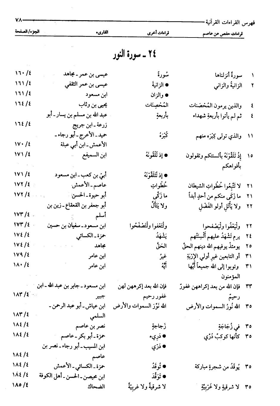 ١: سُورَةٌ أَنْزَلْناها: سورة: عيسى بن عمر- مجاهد: ٤/ ١٦٠ ٢: الزَّانِيَةُ وَالزَّانِي: الزانية: عيسى بن عمر الثقفي: ٤/ ١٦١ والزان: ابن مسعود: ٤/ ١٦١ ٤: وَالَّذِينَ يَرْمُونَ الْمُحْصَناتِ: المحصنات: يحيى بن وثاب: ٤/ ١٦٤ ٤: ثُمَّ لَمْ يَأْتُوا بِأَرْبَعَةِ شُهَداءَ: بأربعة: عبد الله بن مسلم بن يسار- أبو زرعة- ابن جريج: ٤/ ١٦٤ ١١: وَالَّذِي تَوَلَّى كِبْرَهُ مِنْهُمْ: كبره: حميد- الأعرج- أبو رجاء- الأعمش- ابن أبي عبلة: ٤/ ١٧٠ ١٥: إِذْ تَلَقَّوْنَهُ بِأَلْسِنَتِكُمْ وَتَقُولُونَ بِأَفْواهِكُمْ: إذ تلقونه: ابن السميفع: ٤/ ١٧١ إذ تتلقّونه: أبيّ بن كعب- ابن مسعود: ٤/ ١٧١ ٢١: لا تَتَّبِعُوا خُطُواتِ الشَّيْطانِ: خطوات: عاصم- الأعمش: ٤/ ١٧٢ ٢١: ما زَكى مِنْكُمْ مِنْ أَحَدٍ أَبَداً: ما زكّى: أبو حيوة- الحسن: ٤/ ١٧٢ ٢٢: وَلا يَأْتَلِ أُولُوا الْفَضْلِ: ولا يتألّ: أبو جعفر بن القعقاع- زين بن أسلم: ٤/ ١٧٣ ٢٢: وَلْيَعْفُوا وَلْيَصْفَحُوا: ولتعفوا ولتصفحوا: ابن مسعود- سفيان بن حسين: ٤/ ١٧٣ ٢٤: يَوْمَ تَشْهَدُ عَلَيْهِمْ أَلْسِنَتُهُمْ: يشهد: حمزة- الكسائي: ٤/ ١٧٤ ٢٥: يَوْمَئِذٍ يُوَفِّيهِمُ اللَّهُ دِينَهُمُ الْحَقَّ: الحقّ: مجاهد: ٤/ ١٧٤ ٣١: أَوِ التَّابِعِينَ غَيْرِ أُولِي الْإِرْبَةِ: غير: ابن عامر: ٤/ ١٧٩ ٣١: وَتُوبُوا إِلَى اللَّهِ جَمِيعاً أَيُّهَا الْمُؤْمِنُونَ: أيّه: ابن عامر: ٤/ ١٨٠ ٣٣: فَإِنَّ اللَّهَ مِنْ بَعْدِ إِكْراهِهِنَّ غَفُورٌ: فإن الله بعد إكراههن لهن: ابن مسعود- جابر بن عبد الله- ابن رَحِيمٌ: غفور رحيم: جبير: ٤/ ١٨٣ ٣٥: اللَّهُ نُورُ السَّماواتِ وَالْأَرْضِ: الله نوّر السموات والأرض: ابن عياش- أبو عبد الرحمن- السلمي: ٤/ ١٨٣ ٣٥: فِي زُجاجَةٍ: زجاجة: نصر بن عاصم: ٤/ ١٨٤ ٣٥: كَأَنَّها كَوْكَبٌ دُرِّيٌّ: دريء: حمزة- أبو بكر- عاصم: ٤/ ١٨٤ درّي: ابن المسيب- أبو رجاء- نصر بن عاصم: ٤/ ١٨٤ ٣٥: يُوقَدُ مِنْ شَجَرَةٍ مُبارَكَةٍ: توقد: حمزة- الكسائي- الأعمش: ٤/ ١٨٤ توقّد: ابن محيصن- الحسن- أهل الكوفة: ٤/ ١٨٤ ٣٥: لا شَرْقِيَّةٍ وَلا غَرْبِيَّةٍ: لا شرقية ولا غربيّة: الضحاك: ٤/ ١٨٥