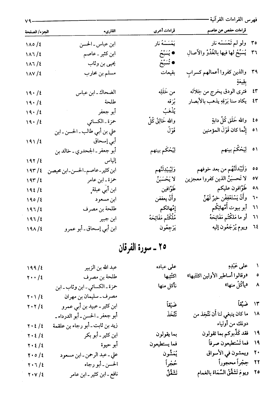 ١: عَلى عَبْدِهِ: على عباده: عبد الله بن الزبير: ٤/ ١٩٩ ٥: «وَقالُوا أَساطِيرُ الْأَوَّلِينَ اكْتَتَبَها» : اكتتبها: طلحة بن مصرف: ٤/ ٢٠٠ ٨: «يَأْكُلُ مِنْها» : نأكل منها: حمزة- الكسائي- ابن وثاب- ابن مصرف- سليمان بن مهران: ٤/ ٢٠١ ١٣: ضَيِّقاً: ضيقا: ابن كثير- عبيد بن أبي عمرو: ٤/ ٢٠٢ ١٨: ما كانَ يَنْبَغِي لَنا أَنْ نَتَّخِذَ مِنْ دُونِكَ مِنْ أَوْلِياءَ: تتّخذ: أبو جعفر- الحسن- أبو الدرداء- زيد بن ثابت- أبو رجاء بن علقمة: ٤/ ٢٠٤ ١٩: فَقَدْ كَذَّبُوكُمْ بِما تَقُولُونَ: بما يقولون: ابن كثير- أبو بكر: ٤/ ٢٠٤ ١٩: فَما تَسْتَطِيعُونَ صَرْفاً: فما يستطيعون: أبو حيوة: ٤/ ٢٠٤ ٢٠: وَيَمْشُونَ فِي الْأَسْواقِ: يمشّون: علي- عبد الرحمن- ابن مسعود: ٤/ ٢٠٥ ٢٢: حِجْراً مَحْجُوراً: حجرا: الحسن- أبو رجاء: ٤/ ٢٠٦ ٢٥: وَيَوْمَ تَشَقَّقُ السَّماءُ بِالْغَمامِ: تشقّقّ: نافع- ابن كثير- ابن عامر: ٤/ ٢٠٧
