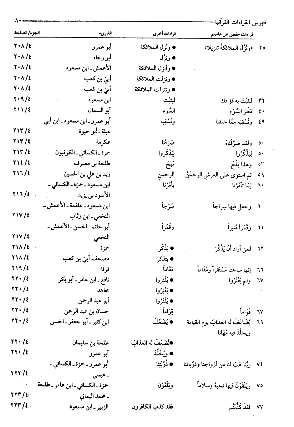 ٢٥: «وَنُزِّلَ الْمَلائِكَةُ تَنْزِيلًا» : ونزل الملائكة: أبو عمرو: ٤/ ٢٠٨ ونزّل: أبو رجاء: ٤/ ٢٠٨ وأنزل الملائكة: الأعمش- ابن مسعود: ٤/ ٢٠٨ ونزلت الملائكة: أبيّ بن كعب: ٤/ ٢٠٨ وتنزلت الملائكة: أبيّ بن كعب: ٤/ ٢٠٨ ٣٢: لِنُثَبِّتَ بِهِ فُؤادَكَ: ليثبّت: ابن مسعود: ٤/ ٢٠٩ ٤٠: مَطَرَ السَّوْءِ: السّوء: أبو السمال: ٤/ ٢١١ ٤٩: وَنُسْقِيَهُ مِمَّا خَلَقْنا: ونسقيه: أبو عمرو- ابن مسعود- ابن أبي عبلة- أبو حيوة: ٤/ ٢١٣ ٥٠: وَلَقَدْ صَرَّفْناهُ: صرفنا: عكرمة: ٤/ ٢١٣ ٥٠: لِيَذَّكَّرُوا: ليذكروا: حمزة- الكسائي- الكوفيون: ٤/ ٢١٣ ٥٣: وَهذا مِلْحٌ: ملح: طلحة بن مصرف: ٤/ ٢١٤ ٥٩: ثُمَّ اسْتَوى عَلَى الْعَرْشِ الرَّحْمنُ: الرحمن: زيد بن علي بن الحسين: ٤/ ٢١٦ ٦٠: لِما تَأْمُرُنا: يأمرنا: ابن مسعود- حمزة- الكسائي- الأسود بن يزيد: ٤/ ٢١٦ ٦١: وَجَعَلَ فِيها سِراجاً: سرجا: ابن مسعود- علقمة- الأعمش- النخعي- ابن وثاب: ٤/ ٢١٧ ٦١: وَقَمَراً مُنِيراً: وقمرا: أبو حاتم- الحسن- الأعمش- النخعي: ٤/ ٢١٧ ٦٢: لِمَنْ أَرادَ أَنْ يَذَّكَّرَ: يذكر: حمزة: ٤/ ٢١٨ يتذكر: مصحف أبيّ بن كعب: ٤/ ٢١٨ ٦٦: إِنَّها ساءَتْ مُسْتَقَرًّا وَمُقاماً: مقاما: فرقة: ٤/ ٢١٩ ٦٧: وَلَمْ يَقْتُرُوا: يقتروا: نافع- ابن عامر- أبو بكر: ٤/ ٢٢٠ يقتروا: مجاهد: ٤/ ٢٢٠ يقتروا: أبو عبد الرحمن: ٤/ ٢٢٠ ٦٧: قَواماً: قواما: حسان بن عبد الرحمن: ٤/ ٢٢٠ ٦٩: يُضاعَفْ لَهُ الْعَذابُ يَوْمَ الْقِيامَةِ وَيَخْلُدْ فِيهِ مُهاناً: يضعّف: ابن كثير- أبو جعفر- الحسن: ٤/ ٢٢٠ نضعّف له العذاب: طلحة بن سليمان: ٤/ ٢٢٠ ويخلّد: أبو عمرو: ٤/ ٢٢٠ ٧٤: رَبَّنا هَبْ لَنا مِنْ أَزْواجِنا وَذُرِّيَّاتِنا: ذرّيّتنا: أبو عمرو- حمزة- الكسائي-- عيسى: ٤/ ٢٢٢ ٧٥: وَيُلَقَّوْنَ فِيها تَحِيَّةً وَسَلاماً: ويلقون: حمزة- الكسائي- ابن عامر- طلحة- محمد اليماني: ٤/ ٢٢٣ ٧٧: فَقَدْ كَذَّبْتُمْ: فقد كذب الكافرون: الزبير- ابن مسعود: ٤/ ٢٢٣