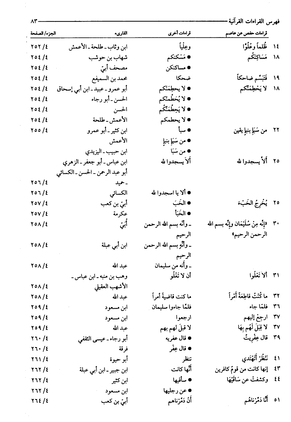 ١٤: ظُلْماً وَعُلُوًّا: وعليا: ابن وثاب- طلحة- الأعمش: ٤/ ٢٥٢ ١٨: مَساكِنَكُمْ: مسكنكم: شهاب بن حوشب: ٤/ ٢٥٤ مساكنكن: مصحف أبيّ: ٤/ ٢٥٤ ١٩: فَتَبَسَّمَ ضاحِكاً: ضحكا: محمد بن السميفع: ٤/ ٢٥٤ ١٨: لا يَحْطِمَنَّكُمْ: لا يحطمنكم: أبو عمرو- عبيد- ابن أبي إسحاق: ٤/ ٢٥٤ لا يحطّمنّكم: الحسن- أبو رجاء: ٤/ ٢٥٤ لا يحطّمنّكم: الحسن: ٤/ ٢٥٤ لا يحطمكم: الأعمش- طلحة: ٤/ ٢٥٤ ٢٢: مِنْ سَبَإٍ بِنَبَإٍ يَقِينٍ: سبأ: ابن كثير- أبو عمرو: ٤/ ٢٥٥ من سبإ بنبإ: الأعمش من سبا: ابن حبيب- اليزيدي ٢٥: أَلَّا يَسْجُدُوا لِلَّهِ: ألا يسجدوا لله: ابن عباس- أبو جعفر- الزهري أبو عبد الرحمن- الحسن- الكسائي- حميد: ٤/ ٢٥٦ ألا يا اسجدوا لله: الكسائي: ٤/ ٢٥٦ ٢٥: يُخْرِجُ الْخَبْءَ: الخب: أبيّ بن كعب: ٤/ ٢٥٧ الخبأ: عكرمة: ٤/ ٢٥٧ ٣٠: «إِنَّهُ مِنْ سُلَيْمانَ وَإِنَّهُ بِسْمِ اللَّهِ: - وأنّه بسم الله الرحمن: أبيّ: ٤/ ٢٥٨ الرَّحْمنِ الرَّحِيمِ» : الرحيم- وأنّه بسم الله الرحمن الرحيم: ابن أبي عبلة: ٤/ ٢٥٨- وأنه من سليمان: عبد الله: ٤/ ٢٥٨ ٣١: أَلَّا تَعْلُوا: أن لا تغلو: وهب بن منبه- ابن عباس- الأشهب العقيلي: ٤/ ٢٥٨ ٣٢: ما كُنْتُ قاطِعَةً أَمْراً: ما كنت قاضية أمرا: عبد الله: ٤/ ٢٥٨ ٣٦: فَلَمَّا جاءَ: فلمّا جاءوا سليمان: ابن مسعود: ٤/ ٢٥٩ ٣٧: ارْجِعْ إِلَيْهِمْ: ارجعوا: ابن مسعود: ٤/ ٢٥٩ ٣٧: لا قِبَلَ لَهُمْ بِها: لا قبل لهم بها: عبد الله: ٤/ ٢٥٩ ٣٩: قالَ عِفْرِيتٌ: قال عفريه: أبو رجاء- عيسى الثقفي: ٤/ ٢٦٠ قال عفر: فرقة: ٤/ ٢٦٠ ٤١: نَنْظُرْ أَتَهْتَدِي: تنظر: أبو حيوة: ٤/ ٢٦١ ٤٣: إِنَّها كانَتْ مِنْ قَوْمٍ كافِرِينَ: أنّها كانت: ابن جبير- ابن أبي عبلة: ٤/ ٢٦٢ ٤٤: كَشَفَتْ عَنْ ساقَيْها