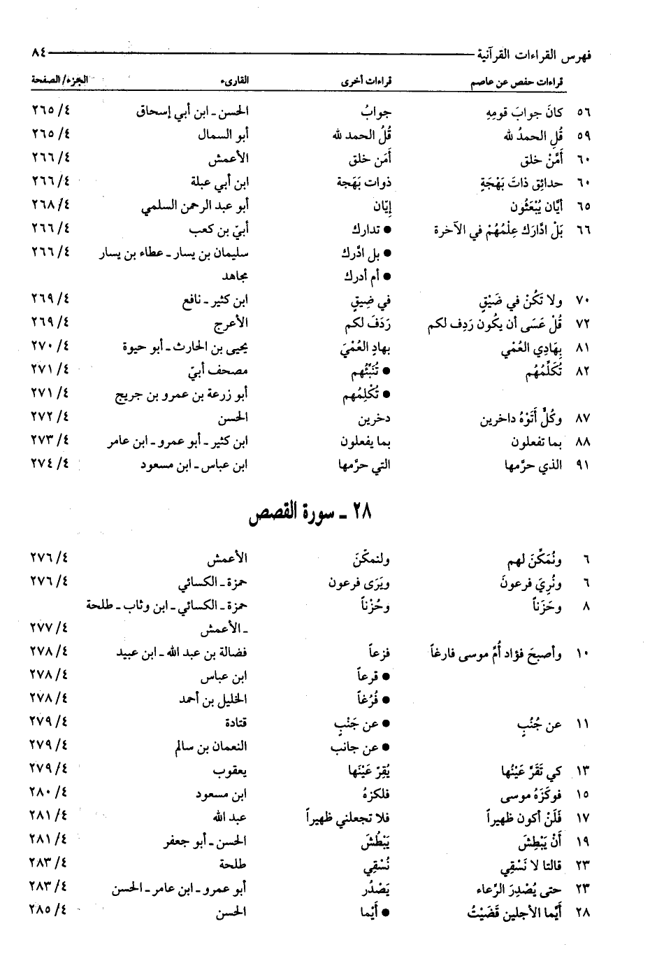 ٦: وَنُمَكِّنَ لَهُمْ: ولنمكّن: الأعمش: ٤/ ٢٧٦ ٦: وَنُرِيَ فِرْعَوْنَ: ويرى فرعون: حمزة- الكسائي: ٤/ ٢٧٦ ٨: وَحَزَناً: وحزنا: حمزة- الكسائي- ابن وثاب- طلحة- الأعمش: ٤/ ٢٧٧ ١٠: وَأَصْبَحَ فُؤادُ أُمِّ مُوسى فارِغاً: فزعا: فضالة بن عبد الله- ابن عبيد: ٤/ ٢٧٨ قرعا: ابن عباس: ٤/ ٢٧٨ فرغا: الخليل بن أحمد: ٤/ ٢٧٨ ١١: عَنْ جُنُبٍ: عن جنب: قتادة: ٤/ ٢٧٩ عن جانب: النعمان بن سالم: ٤/ ٢٧٩ ١٣: كَيْ تَقَرَّ عَيْنُها: يقرّ عينها: يعقوب: ٤/ ٢٧٩ ١٥: فَوَكَزَهُ مُوسى: فلكزه: ابن مسعود: ٤/ ٢٨٠ ١٧: فَلَنْ أَكُونَ ظَهِيراً: فلا تجعلني ظهيرا: عبد الله: ٤/ ٢٨١ ١٩: أَنْ يَبْطِشَ: يبطش: الحسن- أبو جعفر: ٤/ ٢٨١ ٢٣: قالَتا لا نَسْقِي: نسقي: طلحة: ٤/ ٢٨٣ ٢٣: حَتَّى يُصْدِرَ الرِّعاءُ: يصدر: أبو عمرو- ابن عامر- الحسن: ٤/ ٢٨٣ ٢٨: أَيَّمَا الْأَجَلَيْنِ قَضَيْتُ: أيما: الحسن: ٤/ ٢٨٥