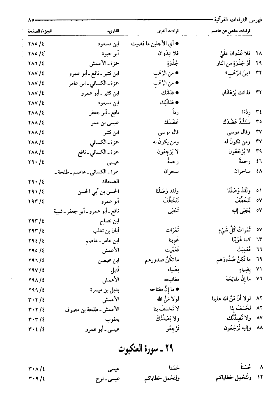 أي الأجلين ما قضيت: ابن مسعود: ٤/ ٢٨٥ ٢٨: فَلا عُدْوانَ عَلَيَّ: فلا عدوان: أبو حيوة: ٤/ ٢٨٥ ٢٩: أَوْ جَذْوَةٍ مِنَ النَّارِ: جذوة: حمزة- الأعمش: ٤/ ٢٨٦ ٣٢: «مِنَ الرَّهْبِ» : من الرّهب: ابن كثير- نافع- أبو عمرو: ٤/ ٢٨٧ من الرّهب: حمزة- الكسائي- ابن عامر: ٤/ ٢٨٧ ٣٢: فَذانِكَ بُرْهانانِ: فذانّك: ابن كثير- أبو عمرو: ٤/ ٢٨٧ فذانّيك: ابن مسعود: ٤/ ٢٨٧ ٣٤: رِدْءاً: ردا: نافع- أبو جعفر: ٤/ ٢٨٨ ٣٥: سَنَشُدُّ عَضُدَكَ: عضدك: عيسى بن عمر: ٤/ ٢٨٨ ٣٧: وَقالَ مُوسى: قال موسى: ابن كثير: ٤/ ٢٨٨ ٣٧: وَمَنْ تَكُونُ لَهُ: ومن يكون له: حمزة- الكسائي: ٤/ ٢٨٨ ٣٩: لا يُرْجَعُونَ: لا يرجعون: حمزة- الكسائي- نافع: ٤/ ٢٨٨ ٤٦: رَحْمَةً: رحمة: عيسى: ٤/ ٢٩٠ ٤٨: سِحْرانِ: ساحران: حمزة- الكسائي- عاصم- طلحة- الضحاك: ٤/ ٢٩٠ ٥١: وَلَقَدْ وَصَّلْنا: ولقد وصلنا: الحسن بن أبي الحسن: ٤/ ٢٩١ ٥٧: نُتَخَطَّفْ: نتخطّف: أبو عمرو: ٤/ ٢٩٣ ٥٧: يُجْبى إِلَيْهِ: تجبى: نافع- أبو عمرو- أبو جعفر- شيبة ابن نصاح: ٤/ ٢٩٣ ٥٧: ثَمَراتُ كُلِّ شَيْءٍ: ثمرات: أبان بن تغلب: ٤/ ٢٩٣ ٦٣: كَما غَوَيْنا: غوينا: ابن عامر- عاصم: ٤/ ٢٩٤ ٦٦: فَعَمِيَتْ: فعمّيت: الأعمش: ٤/ ٢٩٥ ٦٩: ما تُكِنُّ صُدُورُهُمْ: ما تكنّ صدورهم: ابن محيصن: ٤/ ٢٩٦ ٧١: بِضِياءٍ: بضياء: قنبل: ٤/ ٢٩٧ ٧٦: ما إِنَّ مَفاتِحَهُ: مفاتيحه: الأعمش: ٤/ ٢٩٨ ما إنّ مفتاحه: بديل بن ميسرة: ٤/ ٢٩٩ ٨٢: لَوْلا أَنْ مَنَّ اللَّهُ عَلَيْنا: لولا منّ الله: الأعمش: ٤/ ٣٠٢ ٨٢: لَخَسَفَ بِنا: لا نخسف بنا: الأعمش- طلحة بن مصرف: ٤/ ٣٠٢ ٨٧: وَلا يَصُدُّنَّكَ: ولا تصدّنك: يعقوب: ٤/ ٣٠٣ ٨٨: وَإِلَيْهِ تُرْجَعُونَ: ترجعو: عيسى- أبو عمرو: ٤/ ٣٠٤