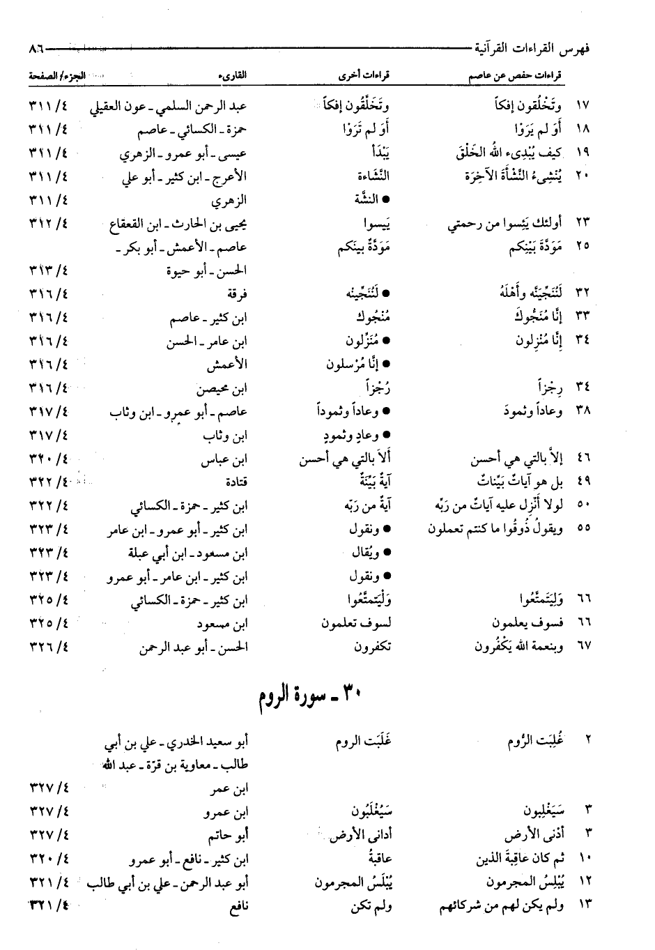٢: غُلِبَتِ الرُّومُ: غلبت الروم: أبو سعيد الخدري- علي بن أبي طالب- معاوية بن قرّة- عبد الله ابن عمر: ٤/ ٣٢٧ ٣: سَيَغْلِبُونَ: سيغلبون: ابن عمرو: ٤/ ٣٢٧ ٣: أَدْنَى الْأَرْضِ: أدانى الأرض: أبو حاتم: ٤/ ٣٢٧ ١٠: ثُمَّ كانَ عاقِبَةَ الَّذِينَ: عاقبة: ابن كثير- نافع- أبو عمرو: ٤/ ٣٢٠ ١٢: يُبْلِسُ الْمُجْرِمُونَ: يبلس المجرمون: أبو عبد الرحمن- علي بن أبي طالب: ٤/ ٣٢١ ١٣: وَلَمْ يَكُنْ لَهُمْ مِنْ شُرَكائِهِمْ: ولم تكن: نافع: ٤/ ٣٢١