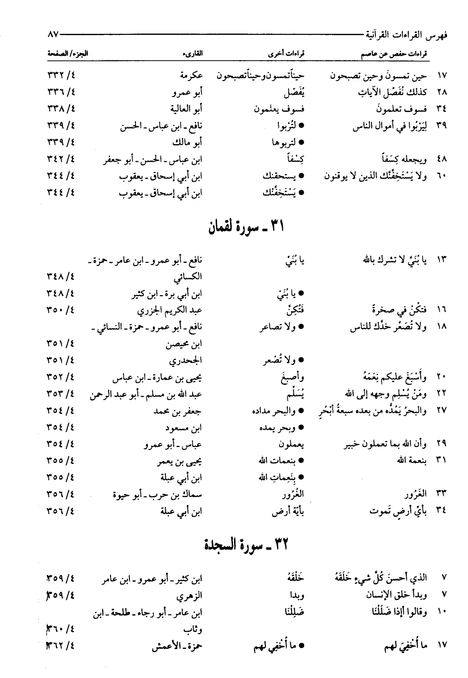١٣: يا بُنَيَّ لا تُشْرِكْ بِاللَّهِ: يا بنيّ: نافع- أبو عمرو- ابن عامر- حمزة- الكسائي: ٤/ ٣٤٨ يا بني: ابن أبي برة- ابن كثير: ٤/ ٣٤٨ ١٦: فَتَكُنْ فِي صَخْرَةٍ: فتكنّ: عبد الكريم الجزري: ٤/ ٣٥٠ ١٨: وَلا تُصَعِّرْ خَدَّكَ لِلنَّاسِ: ولا تصاعر: نافع- أبو عمرو- حمزة- النسائي- ابن محيصن: ٤/ ٣٥١ ولا تصعر: الجحدري: ٤/ ٣٥١ ٢٠: وَأَسْبَغَ عَلَيْكُمْ نِعَمَهُ: وأصبغ: يحيى بن عمارة- ابن عباس: ٤/ ٣٥٢ ٢٢: وَمَنْ يُسْلِمْ وَجْهَهُ إِلَى اللَّهِ: يسلّم: عبد الله بن مسلم- أبو عبد الرحمن: ٤/ ٣٥٣ ٢٧: وَالْبَحْرُ يَمُدُّهُ مِنْ بَعْدِهِ سَبْعَةُ أَبْحُرٍ: والبحر مداده: جعفر بن محمد: ٤/ ٣٥٤ وبحر يمده: ابن مسعود: ٤/ ٣٥٤ ٢٩: وَأَنَّ اللَّهَ بِما تَعْمَلُونَ خَبِيرٌ: يعملون: عباس- أبو عمرو: ٤/ ٣٥٤ ٣١: بِنِعْمَتِ اللَّهِ: بنعمات الله: يحيى بن يعمر: ٤/ ٣٥٥ بنعمات الله: ابن أبي عبلة: ٤/ ٣٥٥ ٣٣: الْغَرُورُ: الغرور: سماك بن حرب- أبو حيوة: ٤/ ٣٥٦ ٣٤: بِأَيِّ أَرْضٍ تَمُوتُ: بأيّة أرض: ابن أبي عبلة: ٤/ ٣٥٦