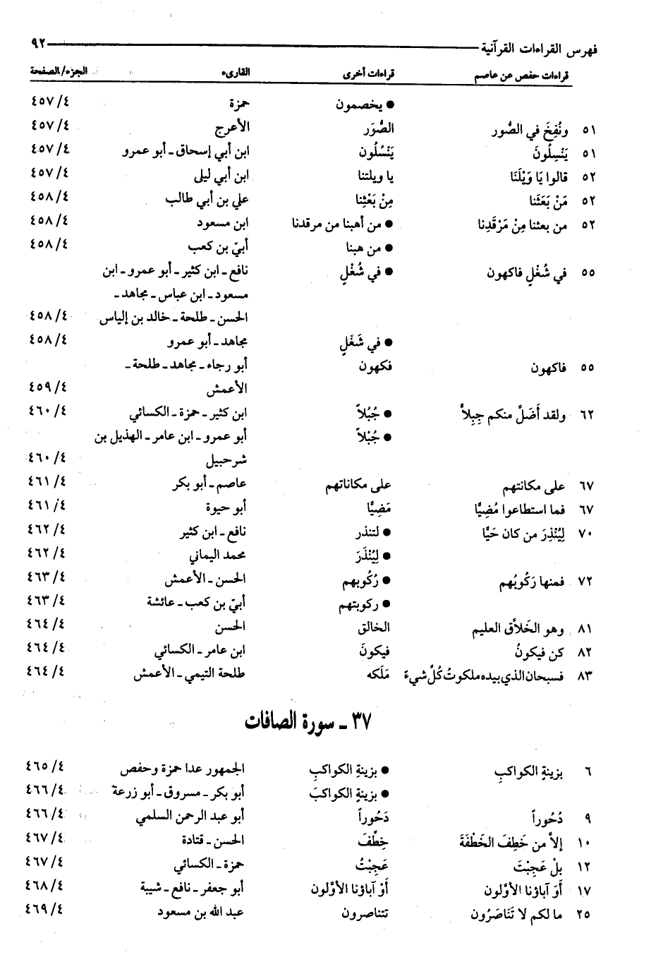 يخصمون: حمزة: ٤/ ٤٥٧ ٥١: وَنُفِخَ فِي الصُّورِ: الصّور: الأعرج: ٤/ ٤٥٧ ٥١: يَنْسِلُونَ: ينسلون: ابن أبي إسحاق- أبو عمرو: ٤/ ٤٥٧ ٥٢: قالُوا يا وَيْلَنا: يا ويلنا: ابن أبي ليلى: ٤/ ٤٥٧ ٥٢: مَنْ بَعَثَنا: من بعثنا: علي بن أبي طالب: ٤/ ٤٥٨ ٥٢: مَنْ بَعَثَنا مِنْ مَرْقَدِنا: من أهبنا من مرقدنا: ابن مسعود: ٤/ ٤٥٨ من هبنا: أبيّ بن كعب: ٤/ ٤٥٨ ٥٥: فِي شُغُلٍ فاكِهُونَ: في شغل: نافع- ابن كثير- أبو عمرو- ابن مسعود- ابن عباس- مجاهد- الحسن- طلحة- خالد بن إلياس: ٤/ ٤٥٨ في شغل: مجاهد- أبو عمرو: ٤/ ٤٥٨ ٥٥: فاكِهُونَ: فكهون: أبو رجاء- مجاهد- طلحة- الأعمش: ٤/ ٤٥٩ ٦٢: وَلَقَدْ أَضَلَّ مِنْكُمْ جِبِلًّا: جبلا: ابن كثير- حمزة- الكسائي: ٤/ ٤٦٠ جبلا: أبو عمرو- ابن عامر- الهذيل بن شرحبيل: ٤/ ٤٦٠ ٦٧: عَلى مَكانَتِهِمْ: على مكاناتهم: عاصم- أبو بكر: ٤/ ٤٦١ ٦٧: فَمَا اسْتَطاعُوا مُضِيًّا: مضيّا: أبو حيوة: ٤/ ٤٦١ ٧٠: لِيُنْذِرَ مَنْ كانَ حَيًّا: لتنذر: نافع- ابن كثير: ٤/ ٤٦٢ لينذر: محمد اليماني: ٤/ ٤٦٢ ٧٢: فَمِنْها رَكُوبُهُمْ: ركوبهم: الحسن- الأعمش: ٤/ ٤٦٣ ركوبتهم: أبيّ بن كعب- عائشة: ٤/ ٤٦٣ ٨١: وَهُوَ الْخَلَّاقُ الْعَلِيمُ: الخالق: الحسن: ٤/ ٤٦٤ ٨٢: كُنْ فَيَكُونُ: فيكون: ابن عامر- الكسائي: ٤/ ٤٦٤ ٨٣: فَسُبْحانَ الَّذِي بِيَدِهِ مَلَكُوتُ كُلِّ شَيْءٍ: ملكه: طلحة التيمي- الأعمش: ٤/ ٤٦٤