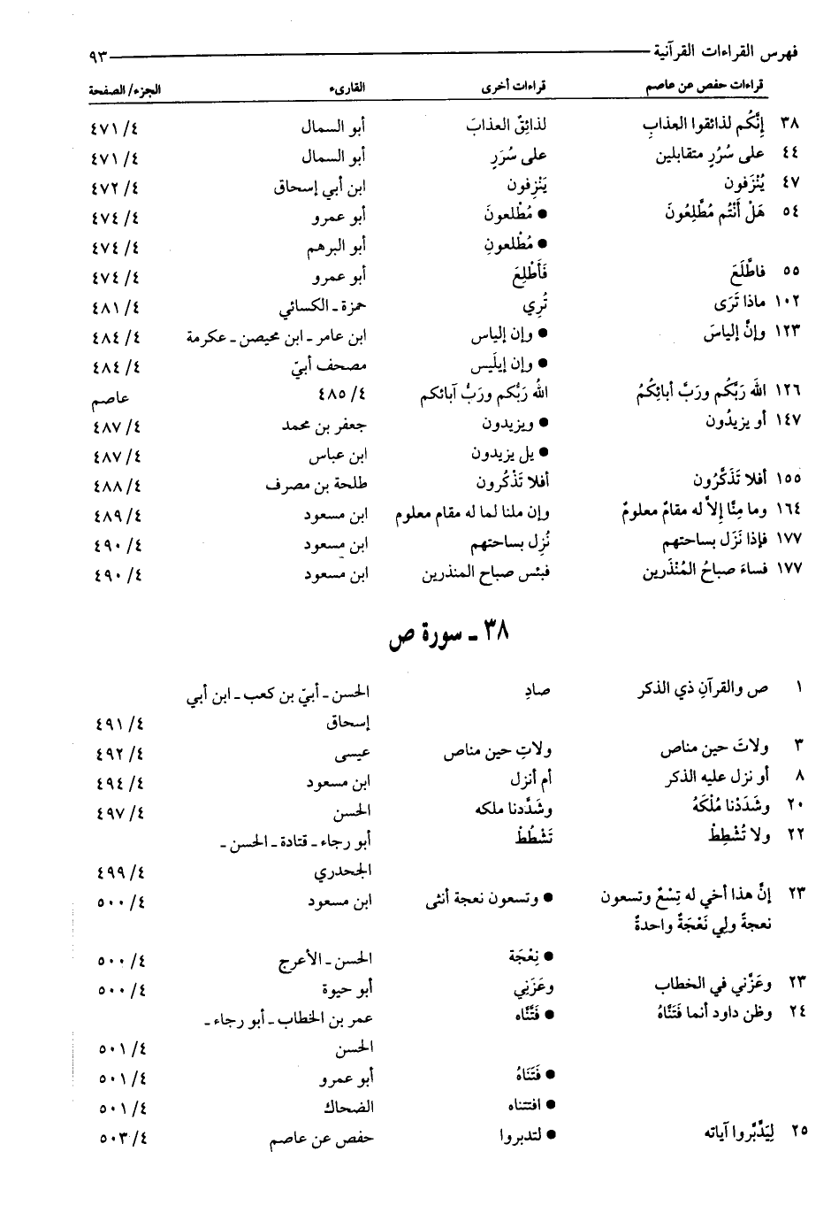 ١: ص وَالْقُرْآنِ ذِي الذِّكْرِ: صاد: الحسن- أبيّ بن كعب- ابن أبي إسحاق: ٤/ ٤٩١ ٣: وَلاتَ حِينَ مَناصٍ: ولات حين مناص: عيسى: ٤/ ٤٩٢ ٨: أَأُنْزِلَ عَلَيْهِ الذِّكْرُ: أم أنزل: ابن مسعود: ٤/ ٤٩٤ ٢٠: وَشَدَدْنا مُلْكَهُ: وشدّدنا ملكه: الحسن: ٤/ ٤٩٧ ٢٢: وَلا تُشْطِطْ: تشطط: أبو رجاء- قتادة- الحسن- الجحدري: ٤/ ٤٩٩ ٢٣: إِنَّ هذا أَخِي لَهُ تِسْعٌ وَتِسْعُونَ نَعْجَةً وَلِيَ نَعْجَةٌ واحِدَةٌ: وتسعون نعجة أنثى: ابن مسعود: ٤/ ٥٠٠ نعجة: الحسن- الأعرج: ٤/ ٥٠٠ ٢٣: وَعَزَّنِي فِي الْخِطابِ: وعزني: أبو حيوة: ٤/ ٥٠٠ ٢٤: وَظَنَّ داوُدُ أَنَّما فَتَنَّاهُ: فتّنّاه: عمر بن الخطاب- أبو رجاء- الحسن: ٤/ ٥٠١ فتناه: أبو عمرو: ٤/ ٥٠١ افتتناه: الضحاك: ٤/ ٥٠١ ٢٥: لِيَدَّبَّرُوا آياتِهِ: لتدبروا: حفص عن عاصم: ٤/ ٥٠٣