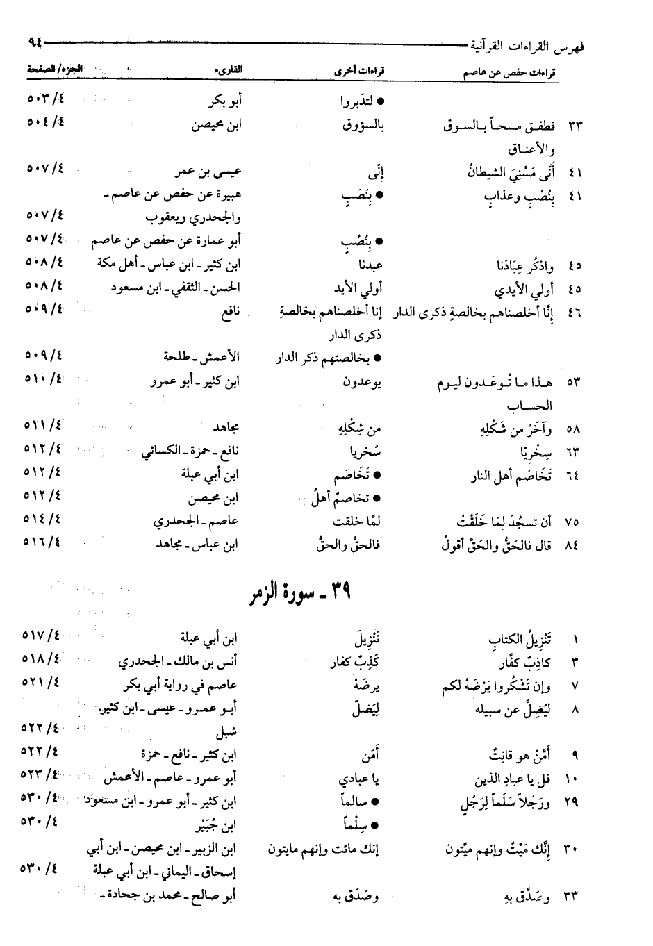 شبل: ٤/ ٥٢٢ ٩: أَمَّنْ هُوَ قانِتٌ: أمن: ابن كثير- نافع- حمزة: ٤/ ٥٢٢ ١٠: قُلْ يا عِبادِ الَّذِينَ: يا عبادي: أبو عمرو- عاصم- الأعمش: ٤/ ٥٢٣ ٢٩: وَرَجُلًا سَلَماً لِرَجُلٍ: سالما: ابن كثير- أبو عمرو- ابن مسعود: ٤/ ٥٣٠ سلما: ابن جبير: ٤/ ٥٣٠ ٣٠: إِنَّكَ مَيِّتٌ وَإِنَّهُمْ مَيِّتُونَ: إنك مائت وإنهم مايتون: ابن الزبير- ابن محيصن- ابن أبي إسحاق- اليماني- ابن أبي عبلة: ٤/ ٥٣٠ ٣٣: وَصَدَّقَ بِهِ: وصدق به: أبو صالح- محمد بن جحادة-