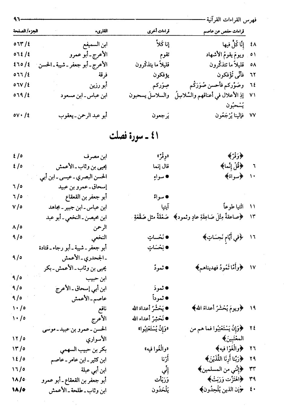 وَقْرٌ: «وقر» : ابن مصرف: ٥/ ٤ ٦: قُلْ إِنَّما: قال إنما: يحيى بن وثاب- الأعمش: ٥/ ٤ ١٠: سَواءً: سواء: الحسن البصري- عيسى- ابن أبي إسحاق- عمرو بن عبيد: ٥/ ٦ سواء: أبو جعفر بن القعقاع: ٥/ ٦ ١١: ائْتِيا طَوْعاً: آتيا: ابن عباس- ابن جبير- مجاهد: ٥/ ٧ ١٣: صاعِقَةً مِثْلَ صاعِقَةِ عادٍ وَثَمُودَ: صعقة مثل صقعة: ابن محيصن- النخعي- أبو عبد الرحمن: ٥/ ٨ ١٦: فِي أَيَّامٍ نَحِساتٍ: نحسات: النخعي: ٥/ ٩ نحسات: أبو جعفر- شيبة- أبو رجاء- قتادة- الجحدري- الأعمش: ٥/ ٩ ١٧: وَأَمَّا ثَمُودُ فَهَدَيْناهُمْ: ثمود: يحيى بن وثاب- الأعمش- بكر ابن حبيب: ٥/ ٩ ثمود: ابن أبي إسحاق- الأعرج: ٥/ ٩ ثمودا: عاصم- الأعمش: ٥/ ٩ ١٩: وَيَوْمَ يُحْشَرُ أَعْداءُ اللَّهِ: يحشر أعداء الله: نافع: ٥/ ١٠ نحشر أعداء الله: الأعرج: ٥/ ١٠ ٢٤: وَإِنْ يَسْتَعْتِبُوا فَما هُمْ مِنَ: «وإن يستعتبوا» : الحسن- عمرو بن عبيد- موسى المعتبين: الأسواري: ٥/ ١٢ ٢٦: وَالْغَوْا فِيهِ: «والغوا فيه» : بكر بن حبيب السهمي: ٥/ ١٣ ٢٩: رَبَّنا أَرِنَا الَّذَيْنِ: أرنا: ابن كثير- ابن عامر- عاصم: ٥/ ١٤ ٣٣: إِنَّنِي مِنَ الْمُسْلِمِينَ: إنّي: ابن أبي عبلة: ٥/ ١٦ ٣٩: اهْتَزَّتْ وَرَبَتْ: وربأت: أبو جعفر بن القعقاع- أبو عمرو: ٥/ ١٨ ٤٠: إِنَّ الَّذِينَ يُلْحِدُونَ: يلحدون: ابن وثاب- طلحة- الأعمش: ٥/ ١٨