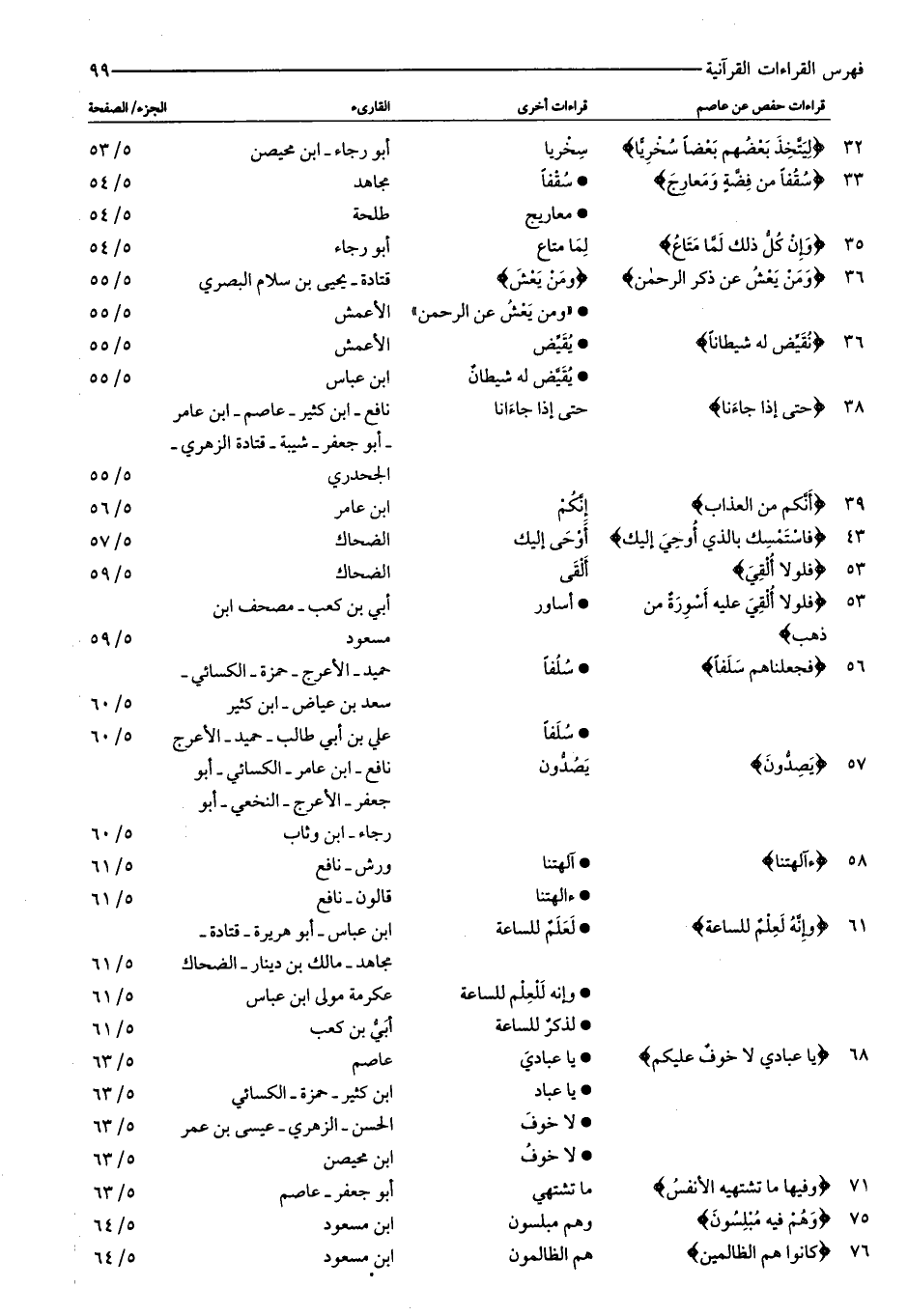 ٣٢: لِيَتَّخِذَ بَعْضُهُمْ بَعْضاً سُخْرِيًّا: سخريا: أبو رجاء- ابن محيصن: ٥/ ٥٣ ٣٣: سُقُفاً مِنْ فِضَّةٍ وَمَعارِجَ: سقفا: مجاهد: ٥/ ٥٤ معاريج: طلحة: ٥/ ٥٤ ٣٥: وَإِنْ كُلُّ ذلِكَ لَمَّا مَتاعُ: لما متاع: أبو رجاء: ٥/ ٥٤ ٣٦: وَمَنْ يَعْشُ عَنْ ذِكْرِ الرَّحْمنِ: ومن يعش: قتادة- يحيى بن سلام البصري: ٥/ ٥٥ «ومن يعش عن الرحمن» : الأعمش: ٥/ ٥٥ ٣٦: نُقَيِّضْ لَهُ شَيْطاناً: يقيّض: الأعمش: ٥/ ٥٥ يقيّض له شيطان: ابن عباس: ٥/ ٥٥ ٣٨: حَتَّى إِذا جاءَنا: حتى إذا جاءانا: نافع- ابن كثير- عاصم- ابن عامر- أبو جعفر- شيبة- قتادة الزهري- الجحدري: ٥/ ٥٥ ٣٩: أَنَّكُمْ فِي الْعَذابِ: إنّكم: ابن عامر: ٥/ ٥٦ ٤٣: فَاسْتَمْسِكْ بِالَّذِي أُوحِيَ إِلَيْكَ: أوحى إليك: الضحاك: ٥/ ٥٧ ٥٣: فَلَوْلا أُلْقِيَ: ألقى: الضحاك: ٥/ ٥٩ ٥٣: فَلَوْلا أُلْقِيَ عَلَيْهِ أَسْوِرَةٌ مِنْ ذَهَبٍ: أساور: أبي بن كعب- مصحف ابن مسعود: ٥/ ٥٩ ٥٦: فَجَعَلْناهُمْ سَلَفاً: سلفا: حميد- الأعرج- حمزة- الكسائي- سعد بن عياض- ابن كثير: ٥/ ٦٠ سلفا: علي بن أبي طالب- حميد- الأعرج: ٥/ ٦٠ ٥٧: يَصِدُّونَ: يصدّون: نافع- ابن عامر- الكسائي- أبو جعفر- الأعرج- النخعي- أبو رجاء- ابن وثاب: ٥/ ٦٠ ٥٨: آلِهَتُنا: آلهتنا: ورش- نافع: ٥/ ٦١ ءالهتنا: قالون- نافع: ٥/ ٦١ ٦١: وَإِنَّهُ لَعِلْمٌ لِلسَّاعَةِ: لعلم للساعة: ابن عباس- أبو هريرة- قتادة- مجاهد- مالك بن دينار- الضحاك: ٥/ ٦١ وإنه للعلم للساعة: عكرمة مولى ابن عباس: ٥/ ٦١ لذكر للساعة: أبيّ بن كعب: ٥/ ٦١ ٦٨: يا عِبادِ لا خَوْفٌ عَلَيْكُمُ: يا عبادي: عاصم: ٥/ ٦٣ يا عباد: ابن كثير- حمزة- الكسائي: ٥/ ٦٣ لا خوف: الحسن- الزهري- عيسى بن عمر: ٥/ ٦٣ لا خوف: ابن محيصن: ٥/ ٦٣ ٧١: وَفِيها ما تَشْتَهِيهِ الْأَنْفُسُ: ما تشتهي: أبو جعفر- عاصم: ٥/ ٦٣ ٧٥: وَهُمْ فِيهِ مُبْلِسُونَ: وهم مبلسون: ابن مسعود: ٥/ ٦٤ ٧٦: كانُوا هُمُ الظَّالِمِينَ: هم الظالمون: ابن مسعود: ٥/ ٦٤