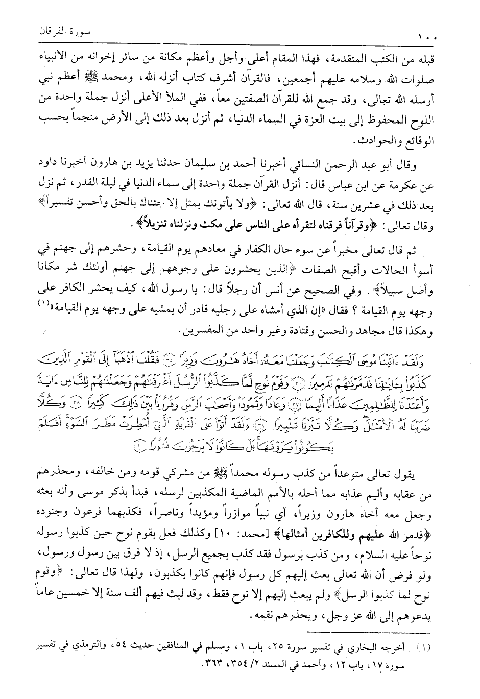 وَلَقَدْ آتَيْنا مُوسَى الْكِتابَ وَجَعَلْنا مَعَهُ أَخاهُ هارُونَ وَزِيراً (35) فَقُلْنَا اذْهَبا إِلَى الْقَوْمِ الَّذِينَ كَذَّبُوا بِآياتِنا فَدَمَّرْناهُمْ تَدْمِيراً (36) وَقَوْمَ نُوحٍ لَمَّا كَذَّبُوا الرُّسُلَ أَغْرَقْناهُمْ وَجَعَلْناهُمْ لِلنَّاسِ آيَةً وَأَعْتَدْنا لِلظَّالِمِينَ عَذاباً أَلِيماً (37) وَعاداً وَثَمُودَ وَأَصْحابَ الرَّسِّ وَقُرُوناً بَيْنَ ذلِكَ كَثِيراً (38) وَكُلاًّ ضَرَبْنا لَهُ الْأَمْثالَ وَكُلاًّ تَبَّرْنا تَتْبِيراً (39)