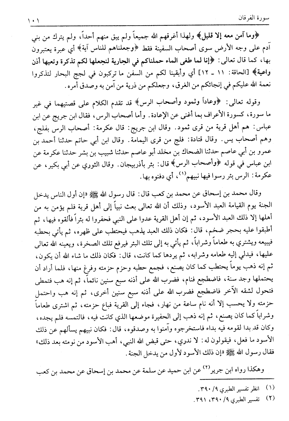 وقوله تعالى: وَعاداً وَثَمُودَ وَأَصْحابَ الرَّسِّ قَدْ تَقَدَّمَ الْكَلَامُ عَلَى قِصَّتَيْهِمَا فِي غَيْرِ ما سورة، كسورة الْأَعْرَافِ بِمَا أَغْنَى عَنِ الْإِعَادَةِ. وَأَمَّا أَصْحَابُ الرَّسِّ، فَقَالَ ابْنُ جُرَيْجٍ عَنِ ابْنِ عَبَّاسٍ: هُمْ أَهْلُ قَرْيَةٍ مِنْ قُرَى ثَمُودَ. وَقَالَ ابْنُ جُرَيْجٍ: قَالَ عِكْرِمَةُ: أَصْحَابُ الرَّسِّ بِفَلْجٍ، وَهُمْ أَصْحَابُ يس. وَقَالَ قَتَادَةُ: فَلْجٌ مِنْ قُرَى الْيَمَامَةِ. وَقَالَ ابْنُ أَبِي حَاتِمٍ حَدَّثَنَا أَحْمَدُ بْنُ عمرو بن أبي عاصم حَدَّثَنَا الضَّحَّاكُ بْنُ مَخْلَدٍ أَبُو عَاصِمٍ حَدَّثَنَا شَبِيبُ بْنُ بِشْرٍ حَدَّثَنَا عِكْرِمَةُ عَنِ ابْنِ عَبَّاسٍ فِي قَوْلِهِ وَأَصْحابَ الرَّسِّ قَالَ: بِئْرٌ بأذربيجان. وقال الثَّوْرِيُّ عَنْ أَبِي بُكَيْرٍ، عَنْ عِكْرِمَةَ: الرَّسُّ بِئْرٌ رَسَوْا فِيهَا نَبِيَّهَمْ «1» ، أَيْ دَفَنُوهُ بِهَا.