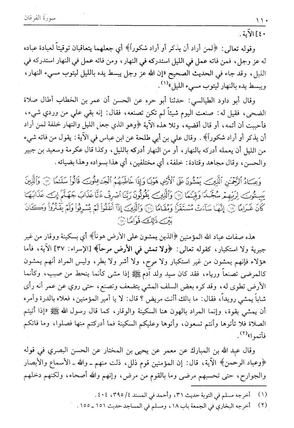 وَعِبادُ الرَّحْمنِ الَّذِينَ يَمْشُونَ عَلَى الْأَرْضِ هَوْناً وَإِذا خاطَبَهُمُ الْجاهِلُونَ قالُوا سَلاماً (63) وَالَّذِينَ يَبِيتُونَ لِرَبِّهِمْ سُجَّداً وَقِياماً (64) وَالَّذِينَ يَقُولُونَ رَبَّنَا اصْرِفْ عَنَّا عَذابَ جَهَنَّمَ إِنَّ عَذابَها كانَ غَراماً (65) إِنَّها ساءَتْ مُسْتَقَرًّا وَمُقاماً (66) وَالَّذِينَ إِذا أَنْفَقُوا لَمْ يُسْرِفُوا وَلَمْ يَقْتُرُوا وَكانَ بَيْنَ ذلِكَ قَواماً (67)