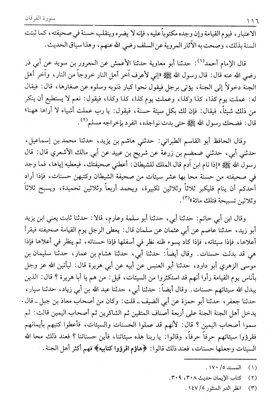 وَقَالَ ابْنُ أَبِي حَاتِمٍ: حَدَّثَنَا أَبِي، حَدَّثَنَا أَبُو سَلَمَةَ وَعَارِمٌ، قَالَا: حَدَّثَنَا ثَابِتٌ يَعْنِي ابْنَ يَزِيدَ أَبُو زَيْدٍ، حَدَّثَنَا عَاصِمٌ عَنْ أبي عثمان عن سلمان قال: يعطى الرجل يَوْمَ الْقِيَامَةِ صَحِيفَتَهُ فَيَقْرَأُ أَعْلَاهَا، فَإِذَا سَيِّئَاتُهُ، فَإِذَا كَادَ يَسُوءُ ظَنُّهُ نَظَرَ فِي أَسْفَلِهَا فَإِذَا حَسَنَاتُهُ، ثُمَّ يَنْظُرُ فِي أَعْلَاهَا فَإِذَا هِيَ قَدْ بُدِّلَتْ حَسَنَاتٍ. وَقَالَ أَيْضًا: حَدَّثَنَا أَبِي، حَدَّثَنَا هِشَامُ بْنُ عَمَّارٍ، حَدَّثَنَا سُلَيْمَانُ بْنُ مُوسَى الزُّهْرِيُّ أَبُو دَاوُدَ، حَدَّثَنَا أَبُو الْعَنْبَسِ عَنْ أَبِيهِ عَنْ أَبِي هُرَيْرَةَ قَالَ: ليأتين الله عز وجل بأناس الزُّهْرِيُّ أَبُو دَاوُدَ، حَدَّثَنَا أَبُو الْعَنْبَسِ عَنْ أَبِيهِ عَنْ أَبِي هُرَيْرَةَ قَالَ: لَيَأْتِينَّ اللَّهُ عَزَّ وَجَلَّ بِأُنَاسٍ يَوْمَ الْقِيَامَةِ رَأَوْا أَنَّهُمْ قَدِ اسْتَكْثَرُوا مِنَ السَّيِّئَاتِ، قِيلَ: مَنْ هُمْ يَا أَبَا هُرَيْرَةَ؟ قَالَ: الَّذِينَ يُبَدِّلُ اللَّهُ سَيِّئَاتِهِمْ حَسَنَاتٍ. وَقَالَ أَيْضًا: حَدَّثَنَا أَبِي، حَدَّثَنَا عَبْدُ اللَّهِ بْنُ أَبِي زِيَادٍ، حَدَّثَنَا سَيَّارٌ، حَدَّثَنَا جَعْفَرٌ، حَدَّثَنَا أَبُو حَمْزَةَ عَنْ أَبِي الضيف- قلت: وَكَانَ مِنْ أَصْحَابِ مُعَاذِ بْنِ جَبَلٍ- قَالَ.