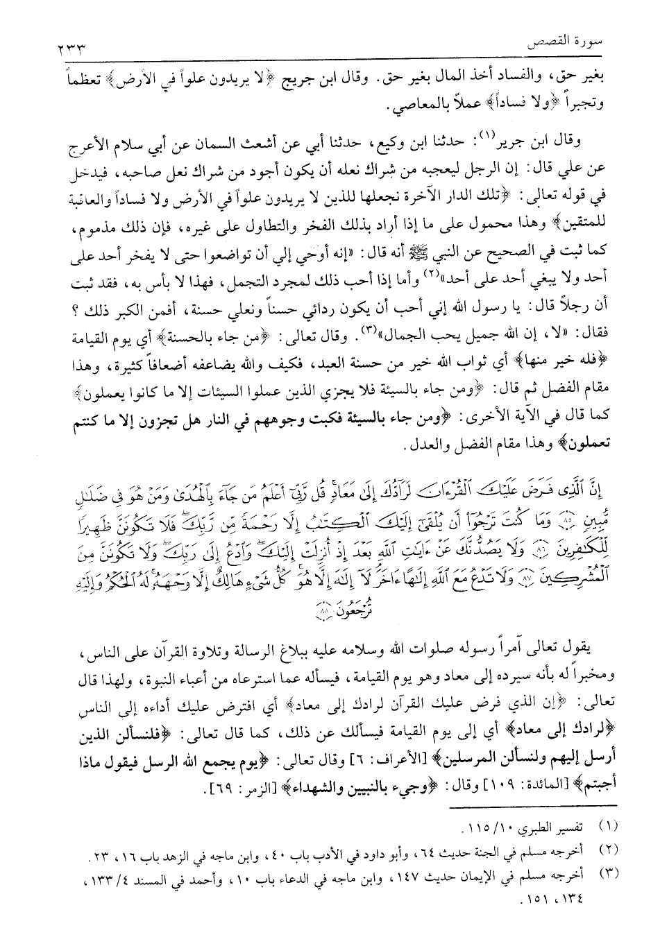 إِنَّ الَّذِي فَرَضَ عَلَيْكَ الْقُرْآنَ لَرادُّكَ إِلى مَعادٍ قُلْ رَبِّي أَعْلَمُ مَنْ جاءَ بِالْهُدى وَمَنْ هُوَ فِي ضَلالٍ مُبِينٍ (85) وَما كُنْتَ تَرْجُوا أَنْ يُلْقى إِلَيْكَ الْكِتابُ إِلاَّ رَحْمَةً مِنْ رَبِّكَ فَلا تَكُونَنَّ ظَهِيراً لِلْكافِرِينَ (86) وَلا يَصُدُّنَّكَ عَنْ آياتِ اللَّهِ بَعْدَ إِذْ أُنْزِلَتْ إِلَيْكَ وَادْعُ إِلى رَبِّكَ وَلا تَكُونَنَّ مِنَ الْمُشْرِكِينَ (87) وَلا تَدْعُ مَعَ اللَّهِ إِلهاً آخَرَ لَا إِلهَ إِلاَّ هُوَ كُلُّ شَيْءٍ هالِكٌ إِلاَّ وَجْهَهُ لَهُ الْحُكْمُ وَإِلَيْهِ تُرْجَعُونَ (88)