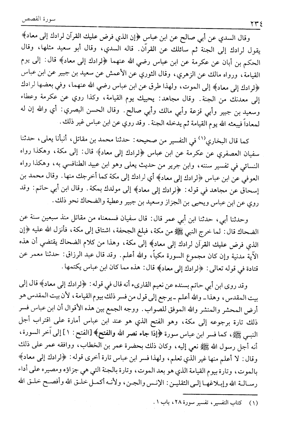 كَمَا قَالَ الْبُخَارِيُّ «1» فِي التَّفْسِيرِ مِنْ صَحِيحِهِ: حَدَّثَنَا مُحَمَّدُ بْنُ مُقَاتِلٍ، أَنْبَأَنَا يَعْلَى، حَدَّثَنَا سُفْيَانُ الْعُصْفُرِيُّ عَنْ عِكْرِمَةَ عَنِ ابْنِ عَبَّاسٍ لَرادُّكَ إِلى مَعادٍ قَالَ: إِلَى مَكَّةَ، وَهَكَذَا رَوَاهُ النَّسَائِيُّ فِي تَفْسِيرِ سُنَنِهِ، وَابْنُ جَرِيرٍ مِنْ حَدِيثِ يَعْلَى وَهُوَ ابْنُ عُبَيْدٍ الطَّنَافِسِيُّ بِهِ، وهكذا رواه الْعَوْفيُّ عَنِ ابْنِ عَبَّاسٍ لَرادُّكَ إِلى مَعادٍ أَيْ لَرَادُّكَ إِلَى مَكَّةَ كَمَا أَخْرَجَكَ مِنْهَا. وَقَالَ مُحَمَّدُ بْنُ إِسْحَاقَ عَنْ مُجَاهِدٍ فِي قَوْلِهِ: لَرادُّكَ إِلى مَعادٍ إِلَى مَوْلِدِكَ بِمَكَّةَ. وقال ابْنُ أَبِي حَاتِمٍ: وَقَدْ رُوِيَ عَنِ ابْنِ عباس ويحيى بن الجزاز وَسَعِيدِ بْنِ جُبَيْرٍ وَعَطِيَّةَ وَالضَّحَّاكِ نَحْوُ ذَلِكَ.