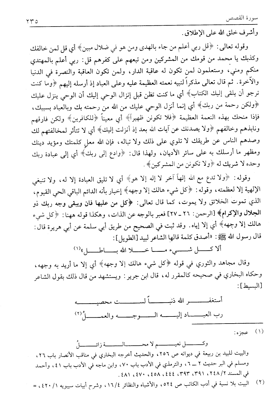 أَلَا كُلُّ شَيْءٍ مَا خَلَا اللَّهَ بَاطِلُ» «1» وَقَالَ مُجَاهِدٌ وَالثَّوْرِيُّ فِي قَوْلِهِ كُلُّ شَيْءٍ هالِكٌ إِلَّا وَجْهَهُ أَيْ إِلَّا مَا أُرِيدَ بِهِ وَجْهُهُ، وَحَكَاهُ الْبُخَارِيُّ فِي صَحِيحِهِ كَالْمُقَرِّرِ لَهُ، قَالَ ابْنُ جَرِيرٍ: وَيَسْتَشْهِدُ مَنْ قَالَ ذلك بقول الشاعر [البسيط] :