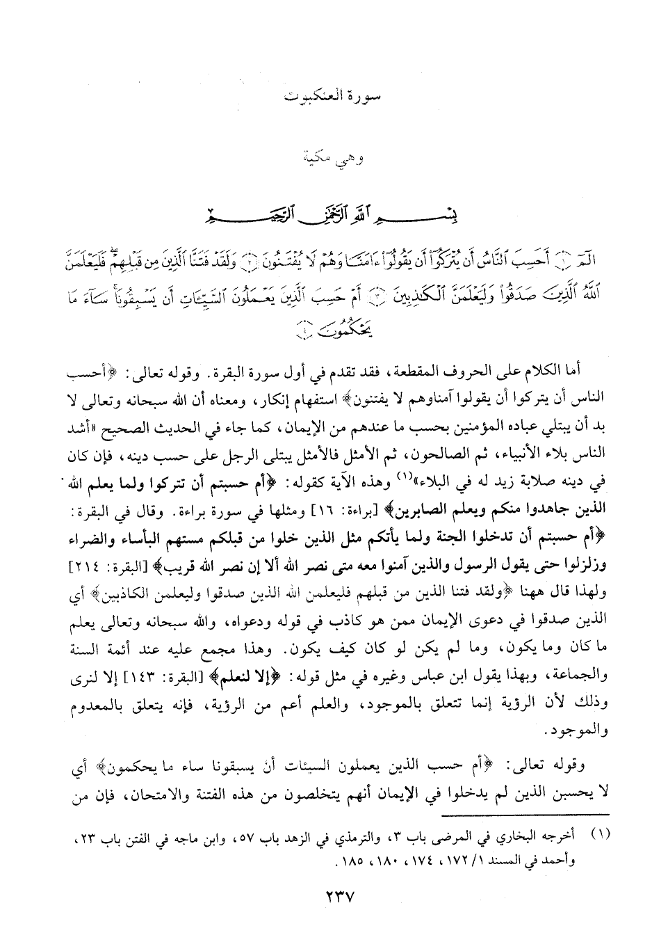 أَمَّا الْكَلَامُ عَلَى الْحُرُوفِ الْمُقَطَّعَةِ، فَقَدْ تَقَدَّمَ في أول سورة البقرة. وقوله تعالى: أَحَسِبَ النَّاسُ أَنْ يُتْرَكُوا أَنْ يَقُولُوا آمَنَّا وَهُمْ لَا يُفْتَنُونَ اسْتِفْهَامُ إِنْكَارٍ، وَمَعْنَاهُ أَنَّ اللَّهَ سُبْحَانَهُ وَتَعَالَى لَا بُدَّ أَنْ يَبْتَلِيَ عِبَادَهُ الْمُؤْمِنِينَ بِحَسْبِ مَا عِنْدَهُمْ مِنَ الْإِيمَانِ، كَمَا جَاءَ فِي الْحَدِيثِ الصَّحِيحِ «أَشَدُّ النَّاسِ بَلَاءً الْأَنْبِيَاءُ، ثُمَّ الصَّالِحُونَ، ثُمَّ الْأَمْثَلُ فَالْأَمْثَلُ يُبْتَلَى الرَّجُلُ عَلَى حَسَبِ دِينِهِ، فَإِنْ كَانَ فِي دِينِهِ صَلَابَةٌ زِيدَ له فِي الْبَلَاءِ» «1» وَهَذِهِ الْآيَةُ كَقَوْلِهِ: أَمْ حَسِبْتُمْ أَنْ تُتْرَكُوا وَلَمَّا يَعْلَمِ اللَّهُ الَّذِينَ جاهَدُوا مِنْكُمْ ... وَيَعْلَمَ الصَّابِرِينَ [براءة: 16] وَمِثْلُهَا فِي سُورَةِ بَرَاءَةٌ. وَقَالَ فِي الْبَقَرَةِ: