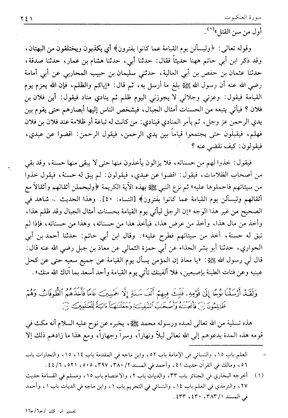 فيقول: خُذُوا لَهُمْ مِنْ حَسَنَاتِهِ، فَلَا يَزَالُونَ يَأْخُذُونَ منها حتى لا يبقى منها حَسَنَةٌ، وَقَدْ بَقِيَ مِنْ أَصْحَابِ الظُّلَامَاتِ، فَيَقُولُ: اقْضُوا عَنْ عَبْدِي، فَيَقُولُونَ: لَمْ يَبْقَ لَهُ حَسَنَةٌ، فَيَقُولُ خُذُوا مِنْ سَيِّئَاتِهِمْ فَاحْمِلُوهَا عَلَيْهِ» ثُمَّ نَزَعَ النَّبِيُّ صَلَّى اللَّهُ عَلَيْهِ وَسَلَّمَ بِهَذِهِ الْآيَةِ الْكَرِيمَةِ وَلَيَحْمِلُنَّ أَثْقالَهُمْ وَأَثْقالًا مَعَ أَثْقالِهِمْ وَلَيُسْئَلُنَّ يَوْمَ الْقِيامَةِ عَمَّا كانُوا يَفْتَرُونَ [النساء: 40] . وَهَذَا الْحَدِيثُ لَهُ شَاهِدٌ فِي الصَّحِيحِ مِنْ غَيْرِ هَذَا الْوَجْهِ «إن الرجل ليأتي يوم القيامة بحسنات أمثال الجبال وقد ظلم هذا، وأخذ من مال هذا، وأخذ من عرض هذا، فيأخذ هذا من حسناته، وهذا من حسناته، فإذا لم تبق له حسنة، أخذ من سيئاتهم فطرح عليه» . وَقَالَ ابْنُ أَبِي حَاتِمٍ: حَدَّثَنَا أَحْمَدُ بْنُ أَبِي الْحِوَارِيِّ، حَدَّثَنَا أَبُو بِشْرٍ الْحَذَّاءُ عَنْ أَبِي حَمْزَةَ الثُّمَالِيِّ عَنْ مُعَاذِ بْنِ جَبَلٍ رَضِيَ اللَّهُ عَنْهُ قَالَ: