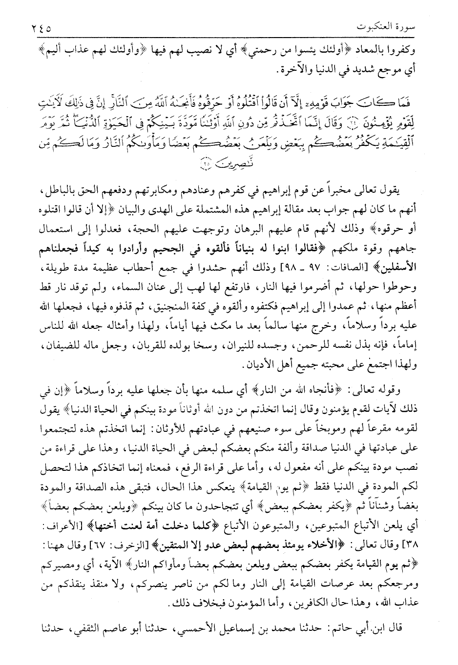 وقوله تعالى: فَأَنْجاهُ اللَّهُ مِنَ النَّارِ أي سلمه مِنْهَا بِأَنْ جَعَلَهَا عَلَيْهِ بَرْدًا وَسَلَامًا إِنَّ فِي ذلِكَ لَآياتٍ لِقَوْمٍ يُؤْمِنُونَ وَقالَ إِنَّمَا اتَّخَذْتُمْ مِنْ دُونِ اللَّهِ أَوْثاناً مَوَدَّةَ بَيْنِكُمْ فِي الْحَياةِ الدُّنْيا يَقُولُ لِقَوْمِهِ مُقَرِّعًا لَهُمْ وموبخا على سوء صنيعهم في عبادتهم للأوثان: إِنَّمَا اتَّخَذْتُمْ هَذِهِ لِتَجْتَمِعُوا عَلَى عِبَادَتِهَا فِي الدُّنْيَا صَدَاقَةً وَأُلْفَةً مِنْكُمْ بَعْضُكُمْ لِبَعْضٍ فِي الْحَيَاةِ الدُّنْيَا، وَهَذَا عَلَى قِرَاءَةِ مَنْ نَصَبَ مَوَدَّةَ بَيْنِكُمْ عَلَى أَنَّهُ مَفْعُولٌ لَهُ، وَأَمَّا عَلَى قِرَاءَةِ الرَّفْعِ، فَمَعْنَاهُ إِنَّمَا اتِّخَاذُكُمْ هَذَا لتحصل لَكُمُ الْمَوَدَّةَ فِي الدُّنْيَا فَقَطْ ثُمَّ يَوْمَ الْقِيامَةِ يَنْعَكِسُ هَذَا الْحَالُ، فَتَبْقَى هَذِهِ الصَّدَاقَةُ والمودة بغضا وشنآنا ثم يَكْفُرُ بَعْضُكُمْ بِبَعْضٍ أَيْ تَتَجَاحَدُونَ مَا كَانَ بَيْنَكُمْ وَيَلْعَنُ بَعْضُكُمْ بَعْضاً أَيْ يَلْعَنُ الْأَتْبَاعُ الْمَتْبُوعِينَ، وَالْمَتْبُوعُونَ الْأَتْبَاعَ كُلَّما دَخَلَتْ أُمَّةٌ لَعَنَتْ أُخْتَها [الْأَعْرَافِ: