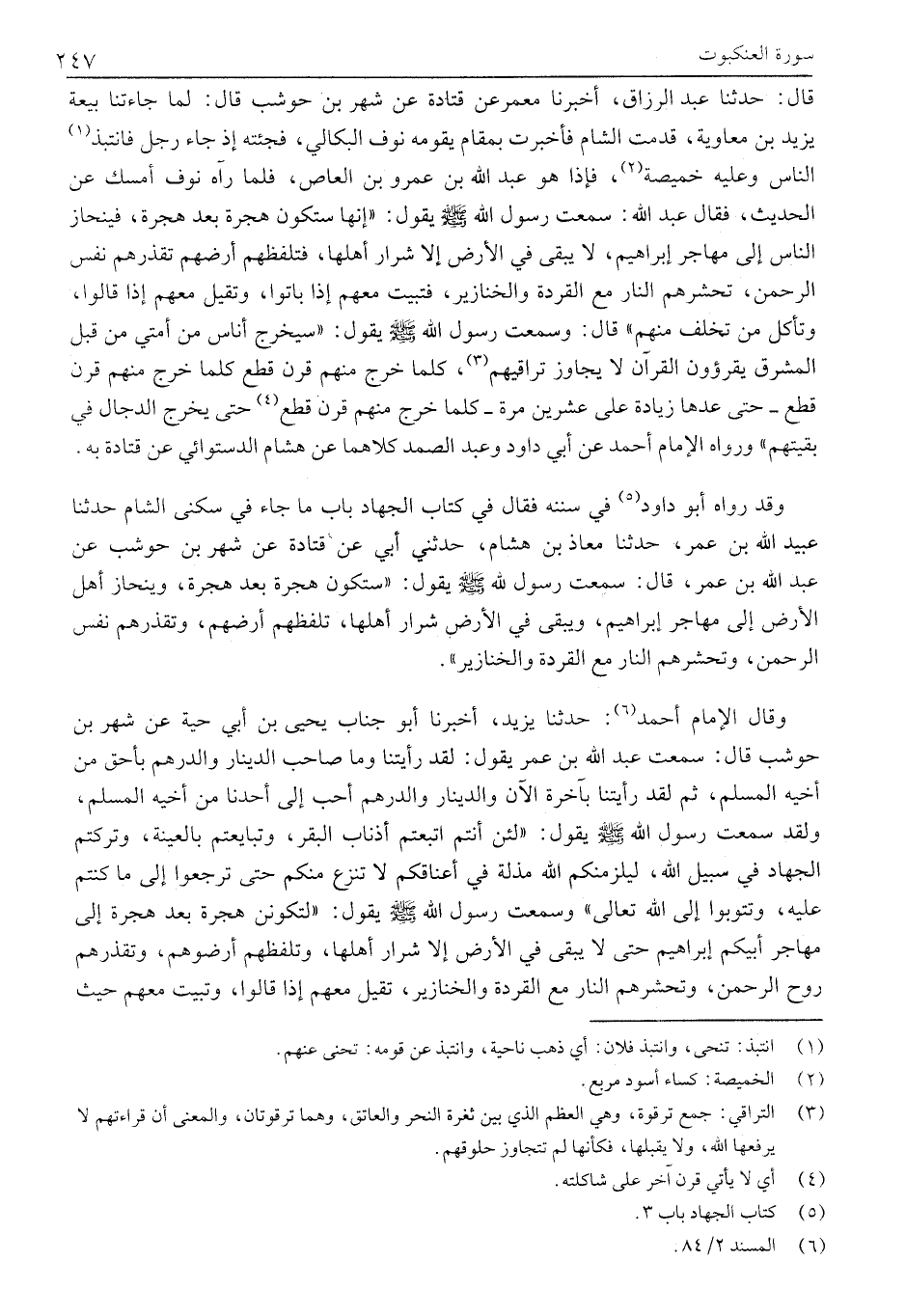 قَالَ: حَدَّثَنَا عَبْدُ الرَّزَّاقِ، أَخْبَرَنَا مَعْمَرٌ عَنْ قَتَادَةَ عَنْ شَهْرِ بْنِ حَوْشَبٍ قَالَ: لَمَّا جَاءَتْنَا بَيْعَةُ يَزِيدَ بْنِ مُعَاوِيَةَ، قَدِمْتُ الشَّامَ فَأُخْبِرْتُ بِمَقَامٍ يَقُومُهُ نَوْفٌ الْبِكَالِيُّ، فَجِئْتُهُ إِذْ جاء رجل فانتبذ «1» الناس وعليه خميصة «2» ، فإذا هُوَ عَبْدُ اللَّهِ بْنُ عَمْرِو بْنِ الْعَاصِ، فَلَمَّا رَآهُ نَوْفٌ أَمْسَكَ عَنِ الْحَدِيثِ، فَقَالَ عَبْدُ اللَّهِ: سَمِعْتُ رَسُولَ اللَّهِ صَلَّى اللَّهُ عَلَيْهِ وَسَلَّمَ يَقُولُ: «إِنَّهَا سَتَكُونُ هِجْرَةٌ بَعْدَ هِجْرَةٍ، فَيَنْحَازُ النَّاسُ إِلَى مُهَاجَرِ إِبْرَاهِيمَ، لَا يَبْقَى فِي الْأَرْضِ إِلَّا شَرَارُ أَهْلِهَا، فَتَلْفِظُهُمْ أرضهم تقْذَرُهُمْ نَفْسُ الرَّحْمَنِ، تَحْشُرُهُمُ النَّارُ مَعَ الْقِرَدَةِ وَالْخَنَازِيرِ، فَتَبِيتُ مَعَهُمْ إِذَا بَاتُوا، وَتَقِيلُ مَعَهُمْ إذا قالوا، وتأكل من تخلف منهم» قَالَ: وَسَمِعَتْ رَسُولَ اللَّهِ صَلَّى اللَّهُ عَلَيْهِ وَسَلَّمَ يَقُولُ: «سَيَخْرُجُ أُنَاسٌ مِنْ أُمَّتِي مِنْ قِبَلِ الْمَشْرِقِ يَقْرَءُونَ الْقُرْآنَ لَا يُجَاوِزُ تَرَاقِيَهُمْ «3» ، كُلَّمَا خَرَجَ مِنْهُمْ قَرْنٌ قُطِعَ كُلَّمَا خَرَجَ مِنْهُمْ قَرْنٌ قُطِعَ- حَتَّى عَدَّهَا زِيَادَةً عَلَى عِشْرِينَ مَرَّةً- كُلَّمَا خَرَجَ مِنْهُمْ قَرْنٌ قُطِعَ «4» حتى يخرج الدجال في بقيتهم» ورواه الإمام أَحْمَدُ عَنْ أَبِي دَاوُدَ وَعَبْدِ الصَّمَدِ كِلَاهُمَا عَنْ هِشَامٍ الدَّسْتُوَائِيِّ عَنْ قَتَادَةَ بِهِ.