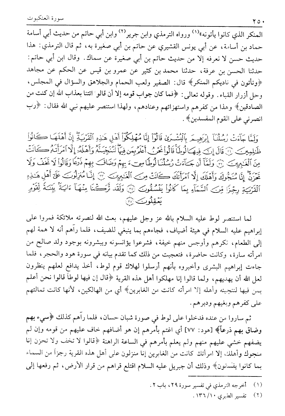 وَلَمَّا جاءَتْ رُسُلُنا إِبْراهِيمَ بِالْبُشْرى قالُوا إِنَّا مُهْلِكُوا أَهْلِ هذِهِ الْقَرْيَةِ إِنَّ أَهْلَها كانُوا ظالِمِينَ (31) قالَ إِنَّ فِيها لُوطاً قالُوا نَحْنُ أَعْلَمُ بِمَنْ فِيها لَنُنَجِّيَنَّهُ وَأَهْلَهُ إِلاَّ امْرَأَتَهُ كانَتْ مِنَ الْغابِرِينَ (32) وَلَمَّا أَنْ جاءَتْ رُسُلُنا لُوطاً سِيءَ بِهِمْ وَضاقَ بِهِمْ ذَرْعاً وَقالُوا لَا تَخَفْ وَلا تَحْزَنْ إِنَّا مُنَجُّوكَ وَأَهْلَكَ إِلاَّ امْرَأَتَكَ كانَتْ مِنَ الْغابِرِينَ (33) إِنَّا مُنْزِلُونَ عَلى أَهْلِ هذِهِ الْقَرْيَةِ رِجْزاً مِنَ السَّماءِ بِما كانُوا يَفْسُقُونَ (34) وَلَقَدْ تَرَكْنا مِنْها آيَةً بَيِّنَةً لِقَوْمٍ يَعْقِلُونَ (35)