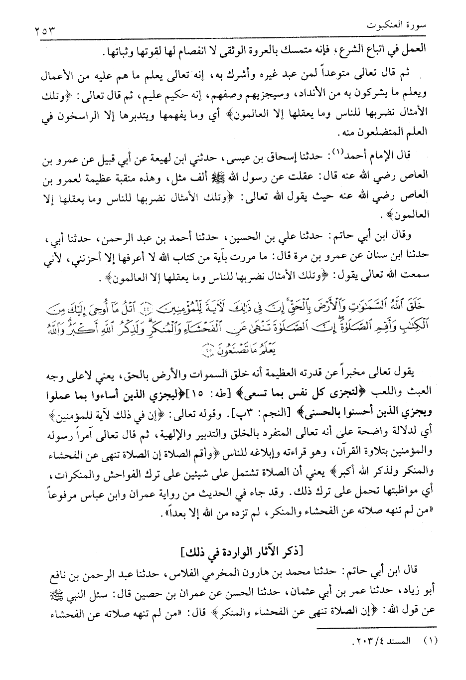 يَقُولُ تَعَالَى مُخْبِرًا عَنْ قُدْرَتِهِ الْعَظِيمَةِ أَنَّهُ خَلَقَ السَّمَوَاتِ وَالْأَرْضَ بِالْحَقِّ، يَعْنِي لَا عَلَى وَجْهِ الْعَبَثِ وَاللَّعِبِ لِتُجْزى كُلُّ نَفْسٍ بِما تَسْعى [طه: 15] لِيَجْزِيَ الَّذِينَ أَساؤُا بِما عَمِلُوا وَيَجْزِيَ الَّذِينَ أَحْسَنُوا بِالْحُسْنَى [النَّجْمِ: 3 پ] . وقوله تعالى: إِنَّ فِي ذلِكَ لَآيَةً لِلْمُؤْمِنِينَ أَيْ لَدَلَالَةً وَاضِحَةً عَلَى أَنَّهُ تَعَالَى الْمُتَفَرِّدُ بِالْخَلْقِ وَالتَّدْبِيرِ وَالْإِلَهِيَّةِ، ثُمَّ قَالَ تَعَالَى آمِرًا رَسُولَهُ وَالْمُؤْمِنِينَ بِتِلَاوَةِ الْقُرْآنِ، وَهُوَ قِرَاءَتُهُ وَإِبْلَاغُهُ لِلنَّاسِ وَأَقِمِ الصَّلاةَ إِنَّ الصَّلاةَ تَنْهى عَنِ الْفَحْشاءِ وَالْمُنْكَرِ وَلَذِكْرُ اللَّهِ أَكْبَرُ يَعْنِي أَنَّ الصَّلَاةَ تَشْتَمِلُ عَلَى شَيْئَيْنِ عَلَى تَرْكِ الْفَوَاحِشِ وَالْمُنْكَرَاتِ، أَيْ مُوَاظَبَتَهَا تَحْمِلُ عَلَى تَرْكِ ذَلِكَ. وَقَدْ جَاءَ فِي الْحَدِيثِ مِنْ رِوَايَةِ عِمْرَانَ وَابْنِ عَبَّاسٍ مَرْفُوعًا «مَنْ لَمْ تَنْهَهُ صَلَاتُهُ عَنِ الْفَحْشَاءِ وَالْمُنْكَرِ، لَمْ تَزِدْهُ مِنَ اللَّهِ إِلَّا بُعْدًا» .